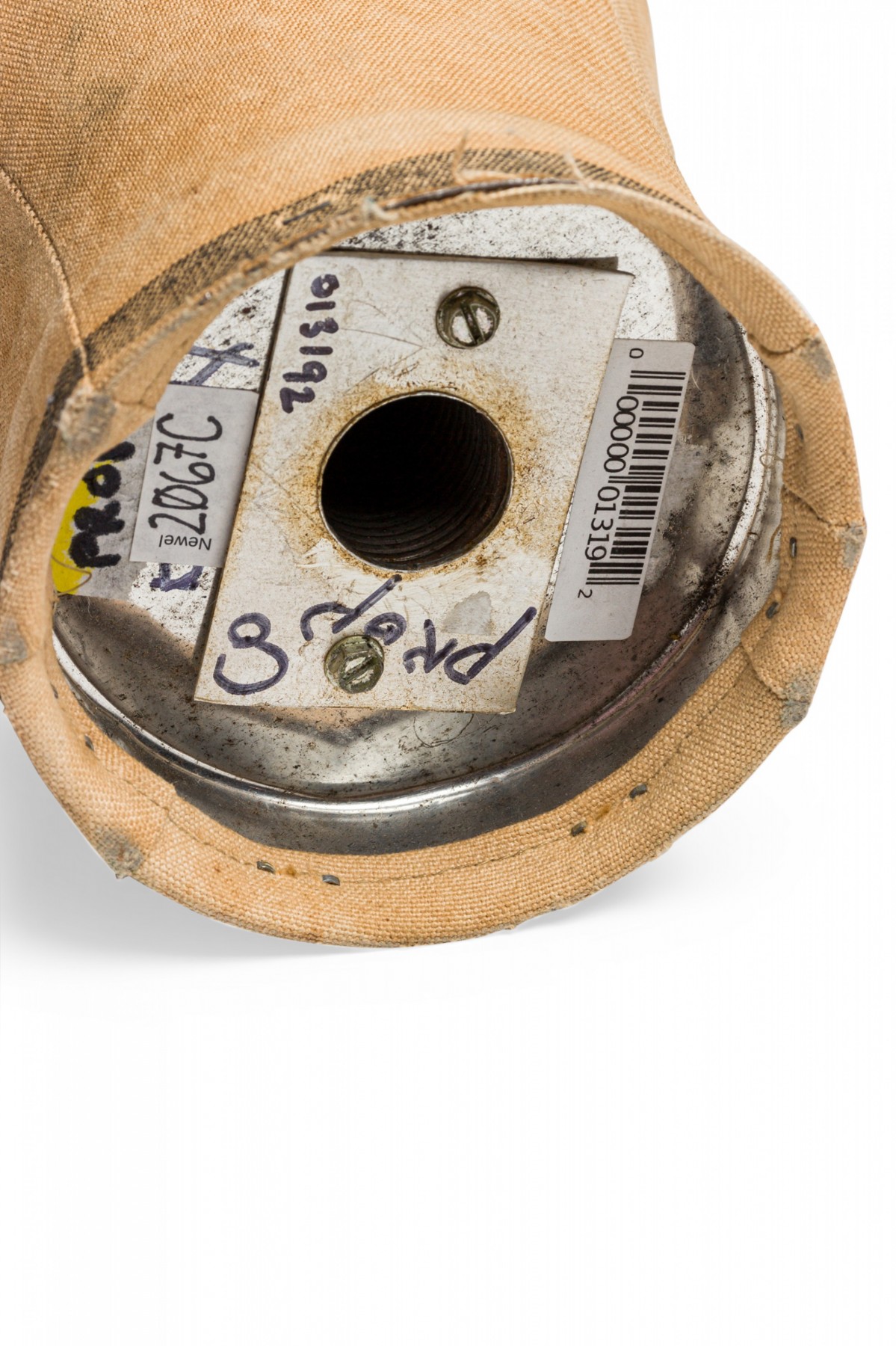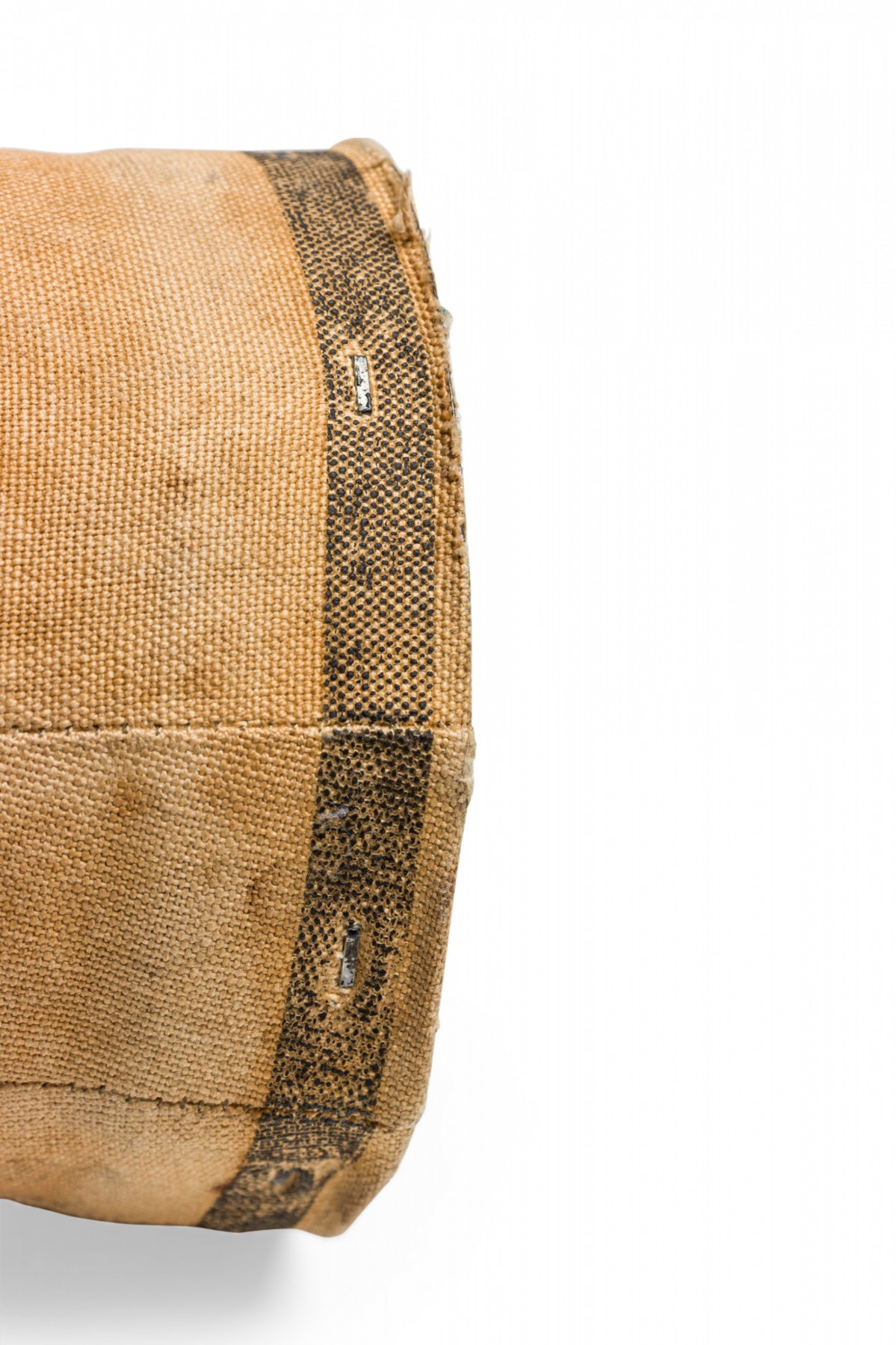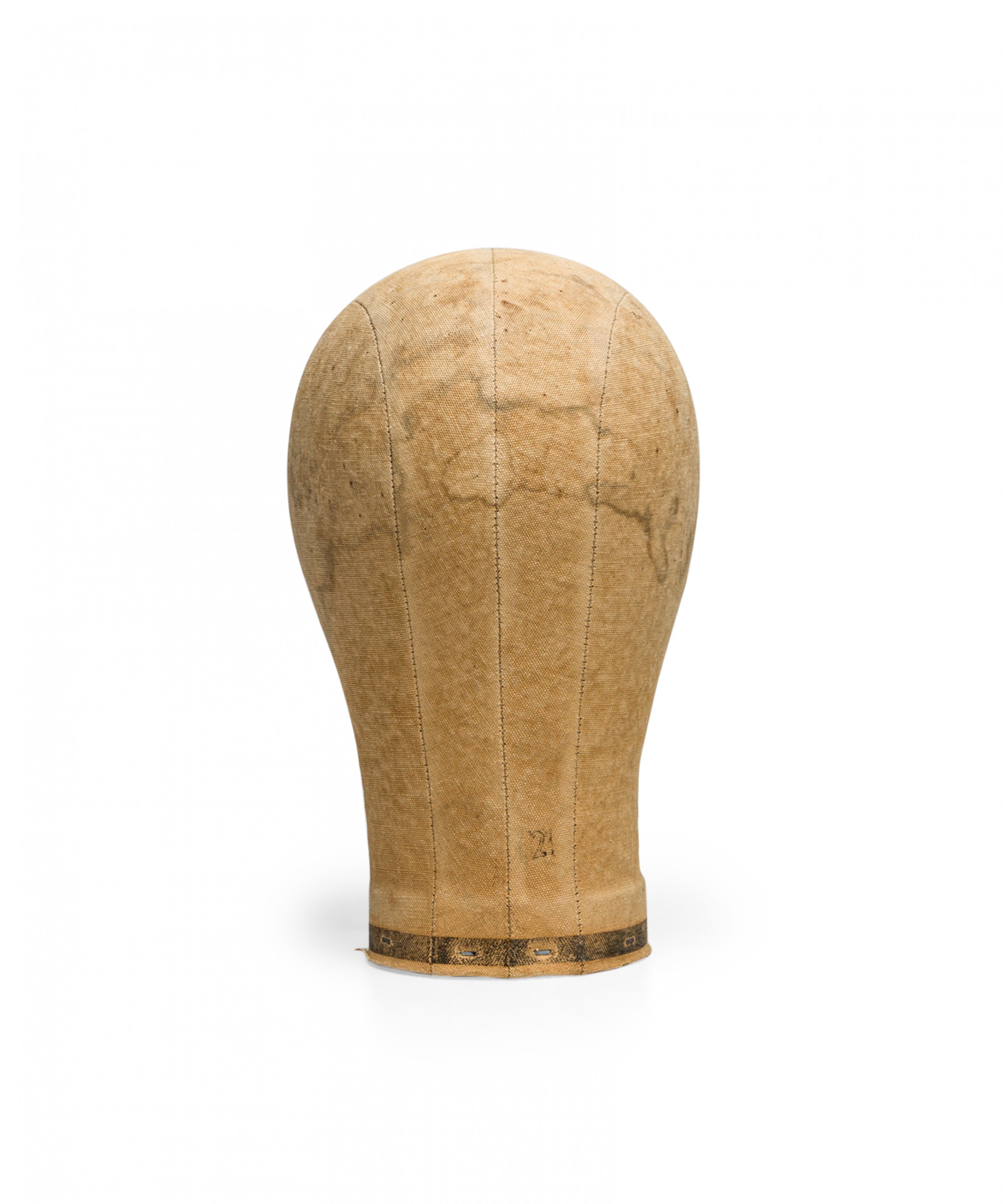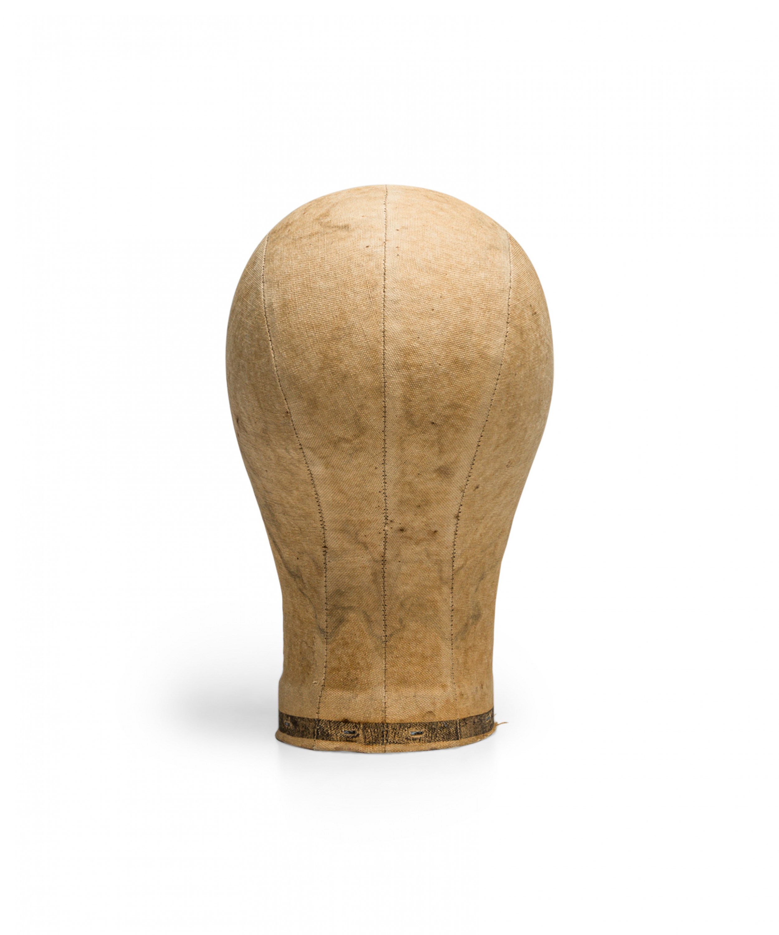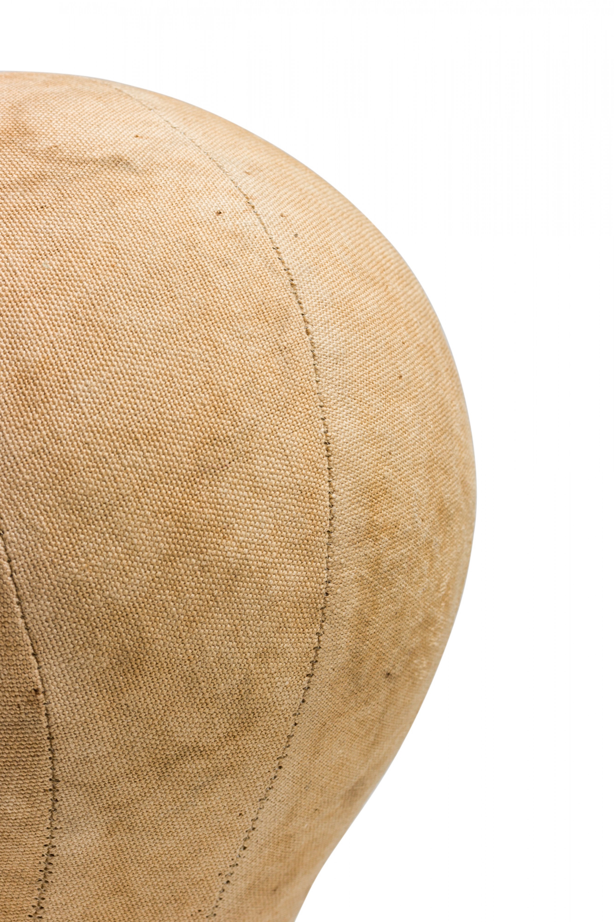 Vintage taupe-colored canvas padded millinery form on a brown circular plastic base
