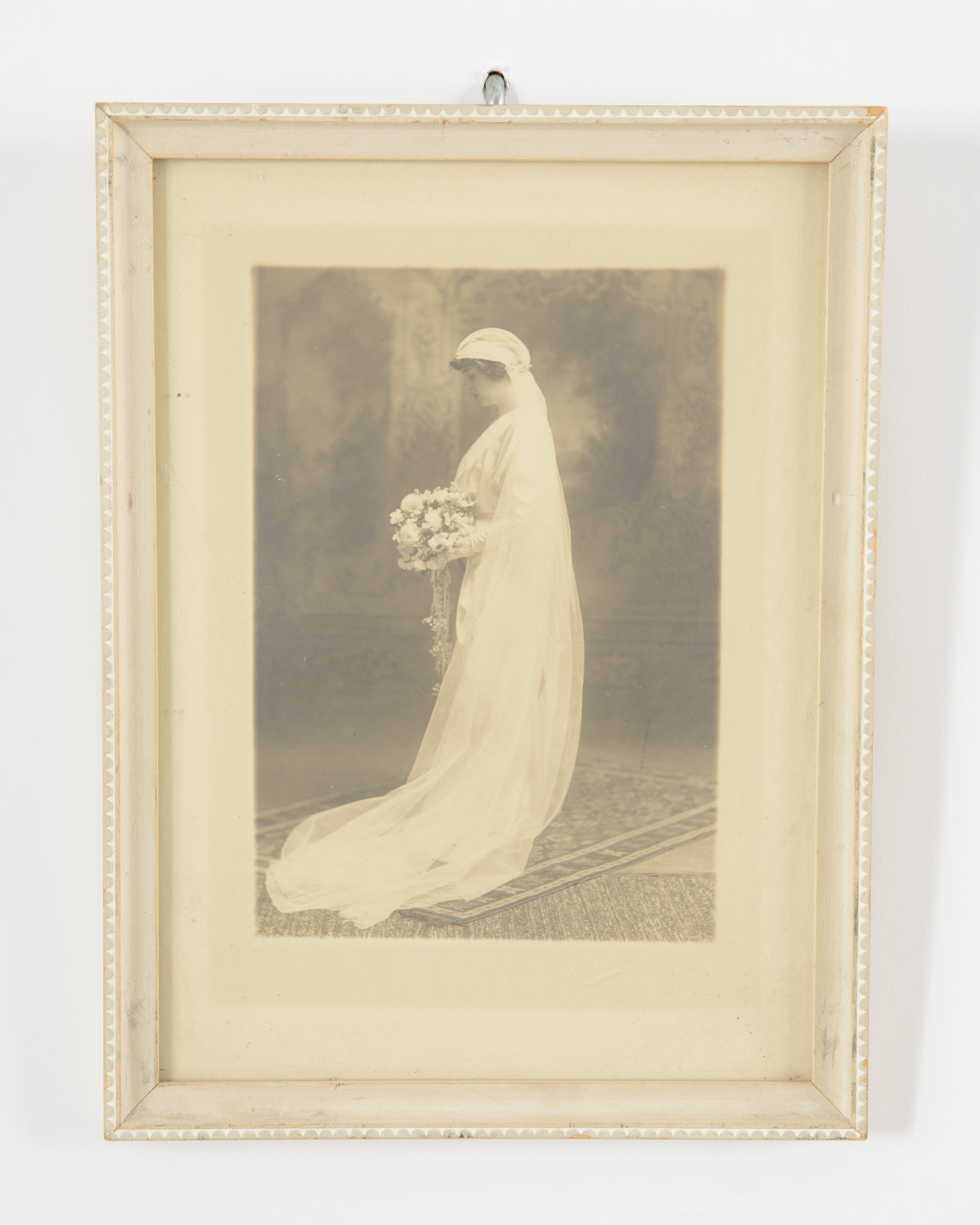 Vintage black and white bridal photograph portrait in cream-colored matting and a light wood frame with scalloped edges