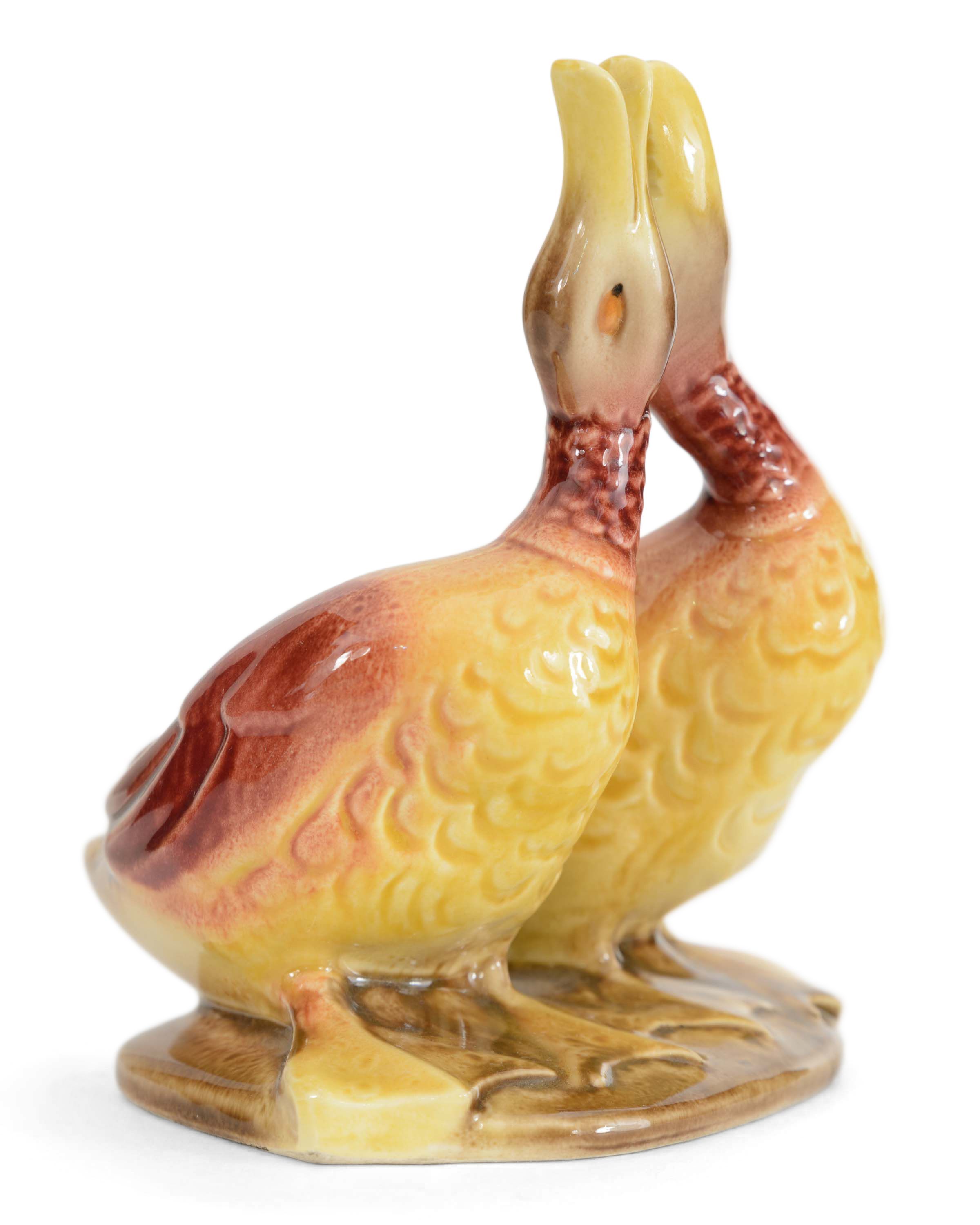 Vintage ceramic figurine/planter of two ducks on a base, glazed in yellow, maroon and brown