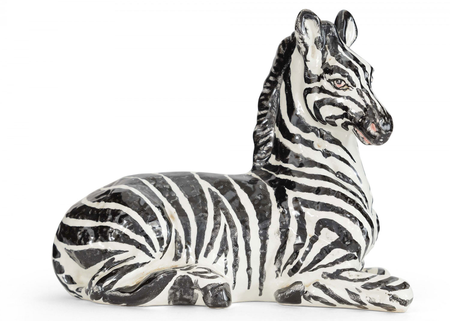 Vintage black and white glazed ceramic statue of a sitting zebra