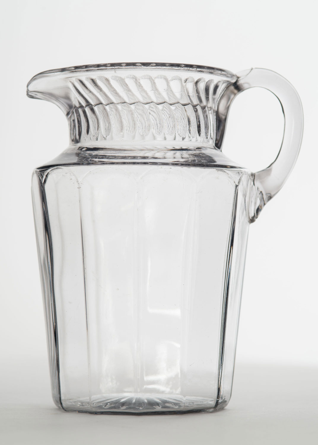 Vintage faceted clear glass pitcher with a raised pattern around the neck