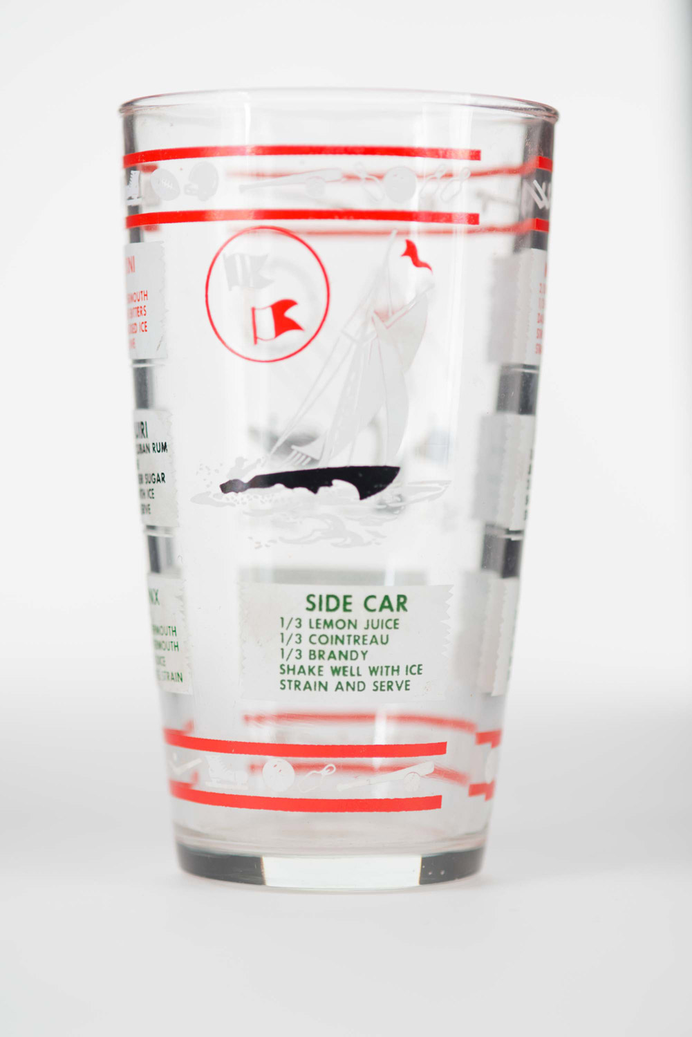 2 Vintage cocktail mixing glass with cocktail recipes printed in white, black and red (PRICED EACH)