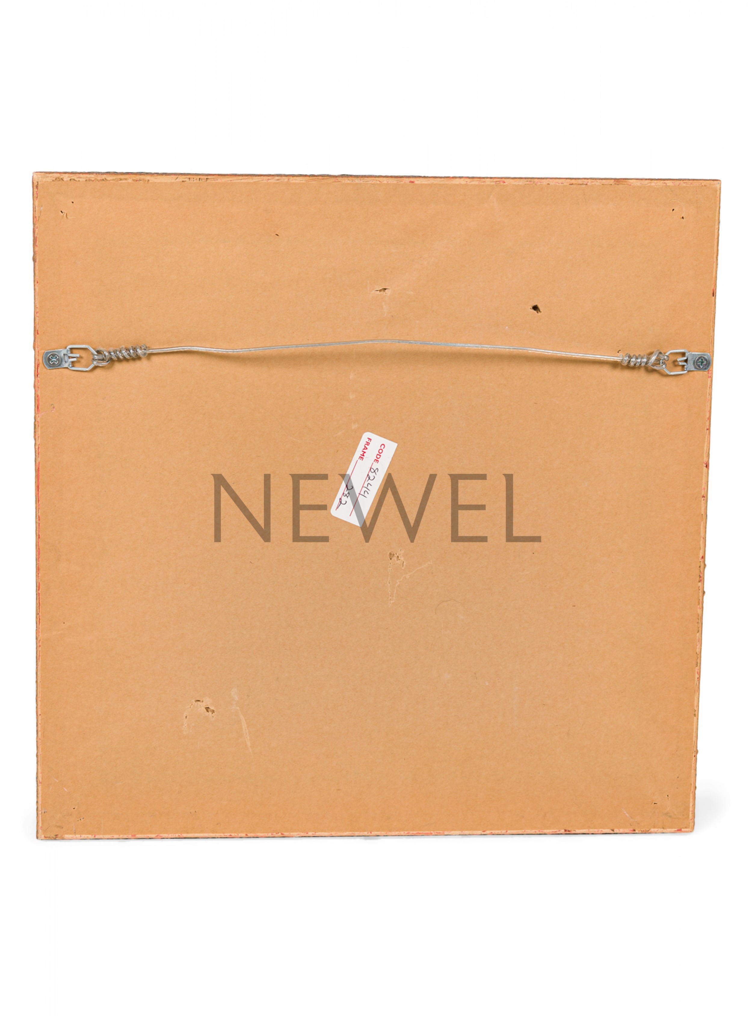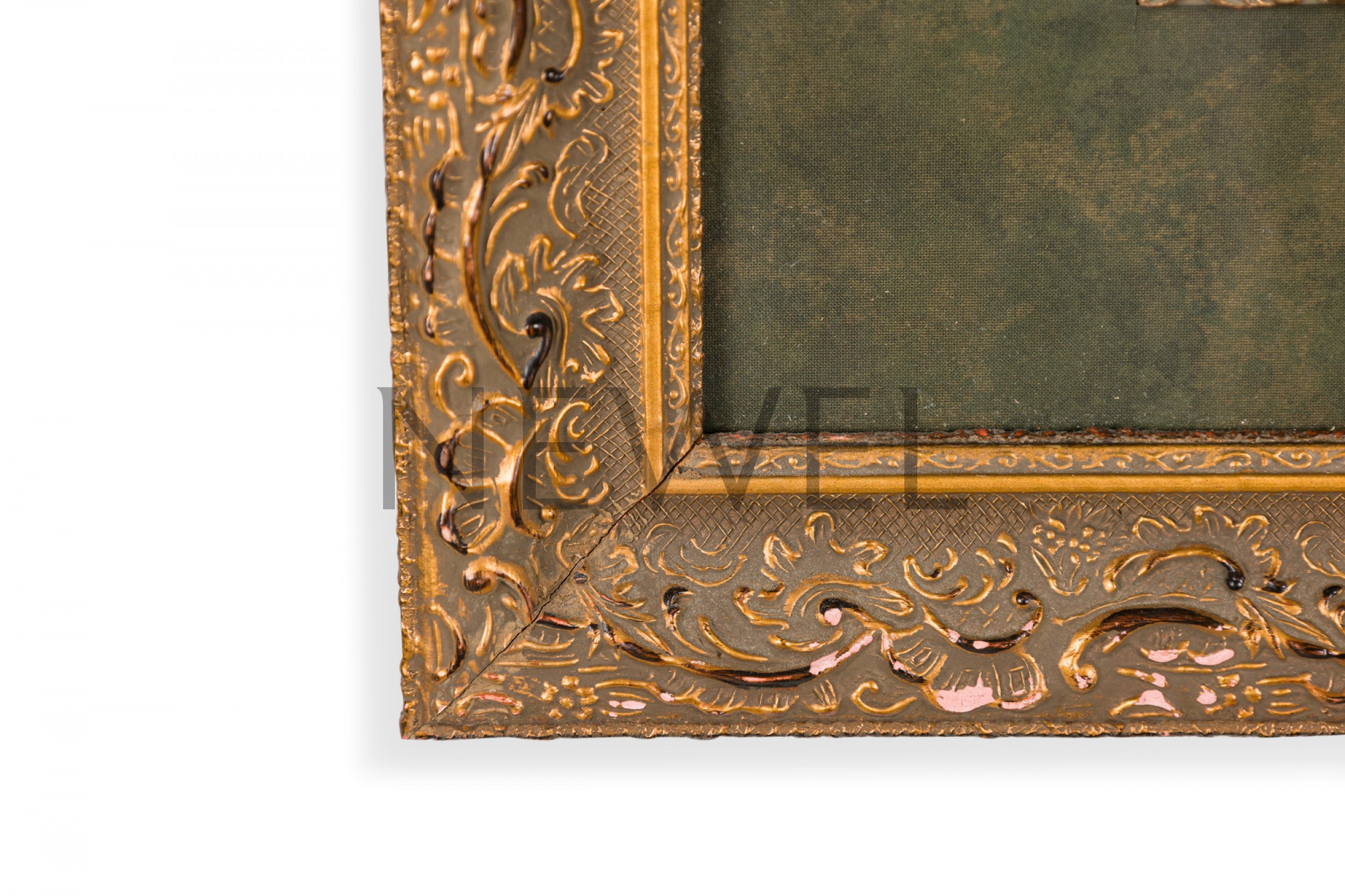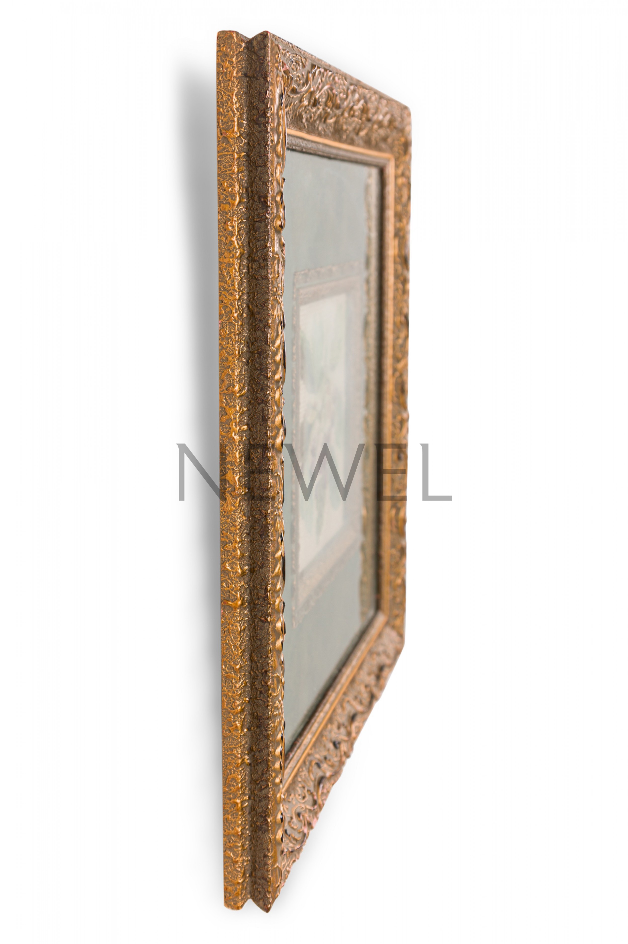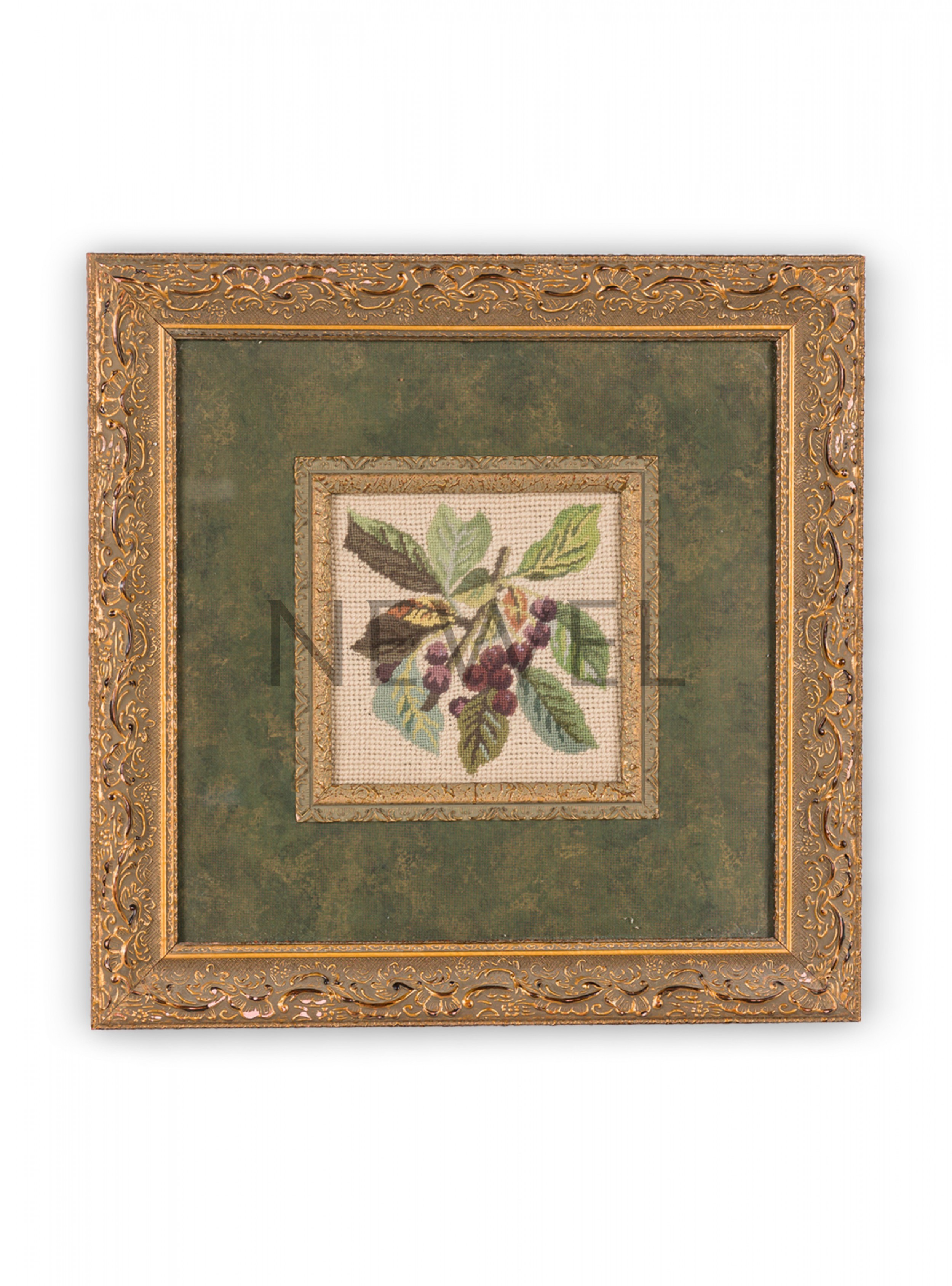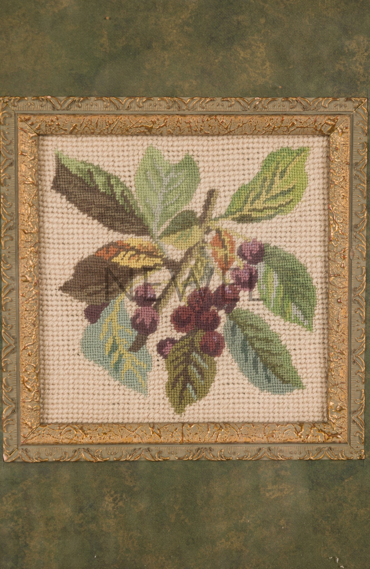 Vintage framed embroidery piece of a ripe purple berries hanging from a leafy branch in a marbled sage green mat with an ornate gilt patterned bevel, mounted in a carved square giltwood frame. (Companion pieces: AAP6290A, AAP6290C)