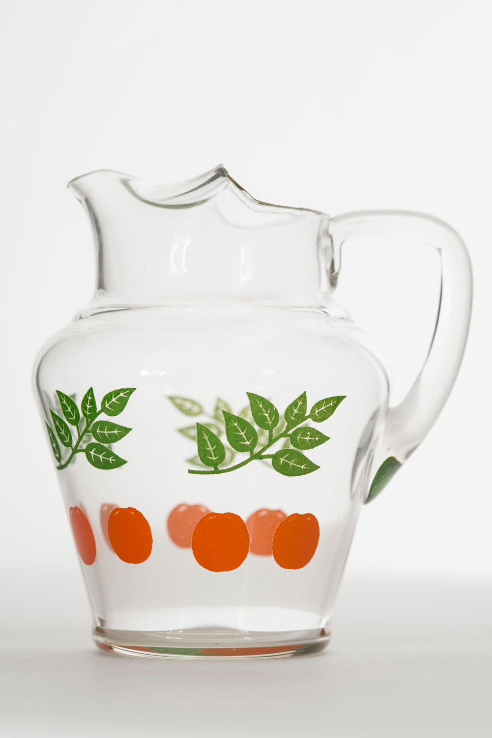 Vintage clear glass pitcher with a printed design of oranges and leaves