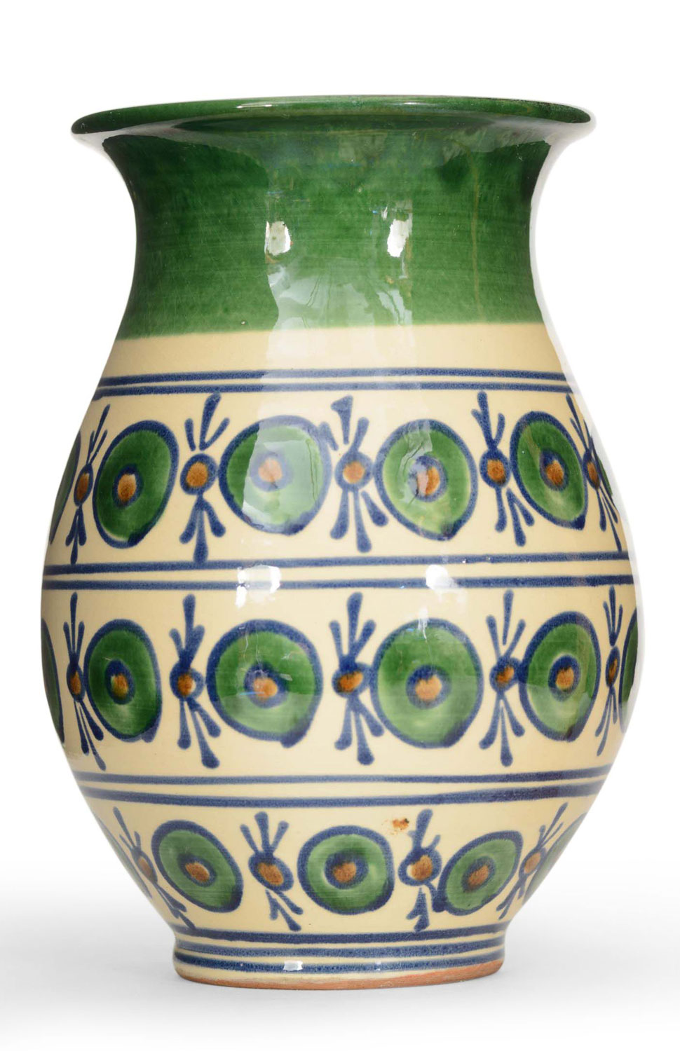 Vintage Bulbous-shaped ivory and green glazed ceramic vase with a wide neck, a flared rim, and a painted design of lines and circles in green, blue and brown