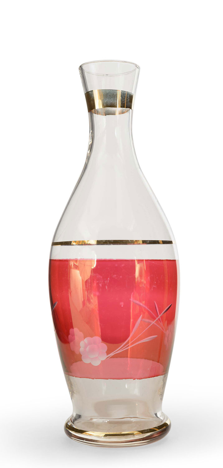 Vintage bottle-shaped glass bud vase with a wide magenta tinted band and etched flowers around the center of the body and three gilded bands