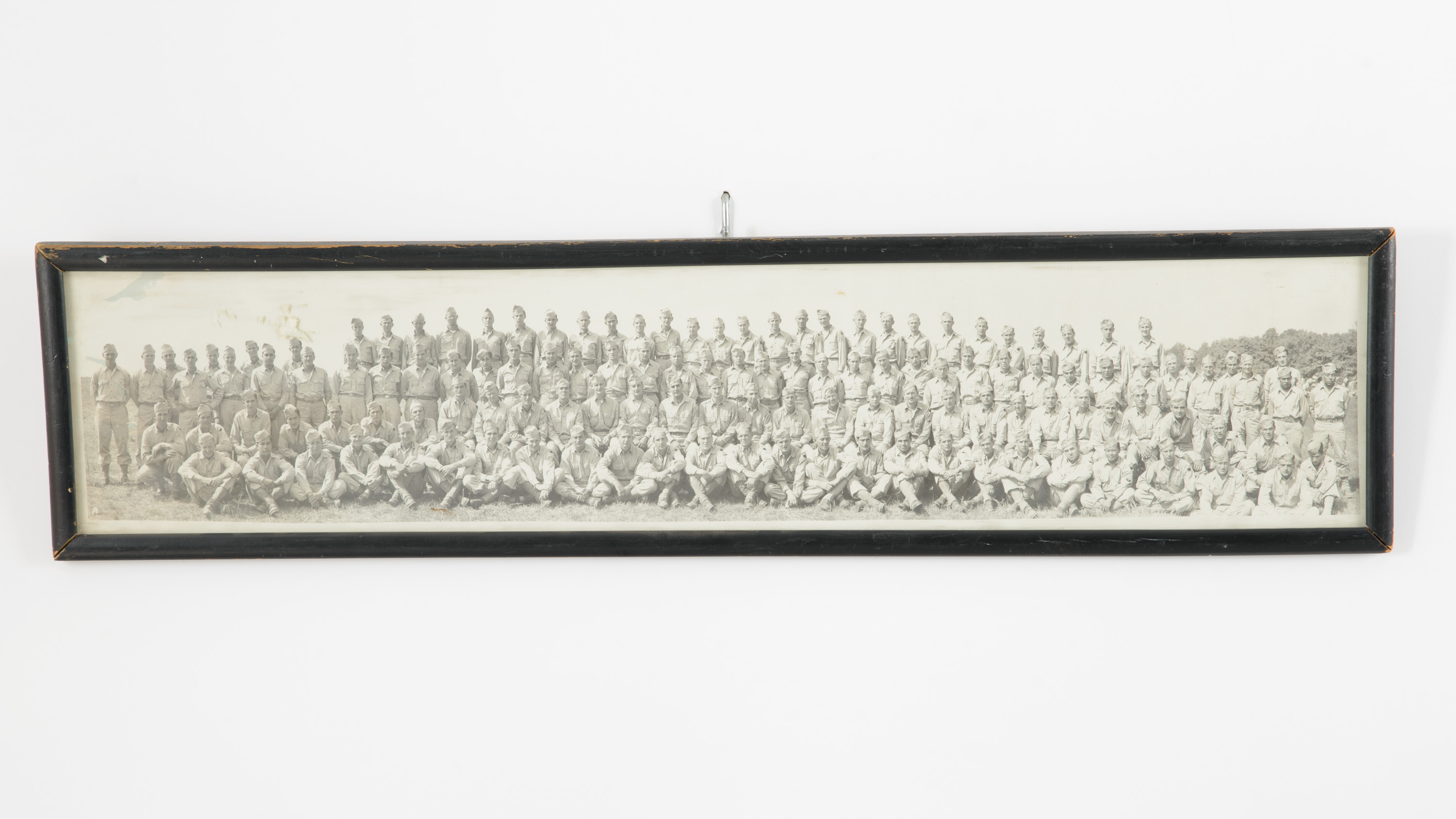 Vintage sepia toned photograph of a military battalion under clear plexiglass in a black painted extra long rectangular wooden frame