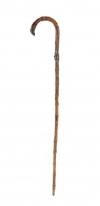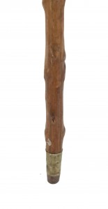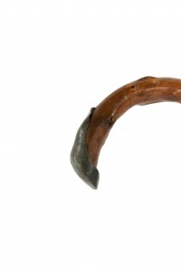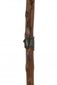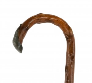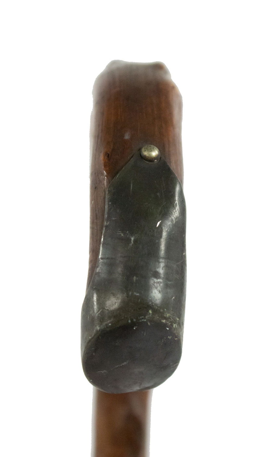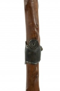 Varnished dark natural wood cane with a hooked top, a decorative iron band with a spiral pattern, and iron tip covers