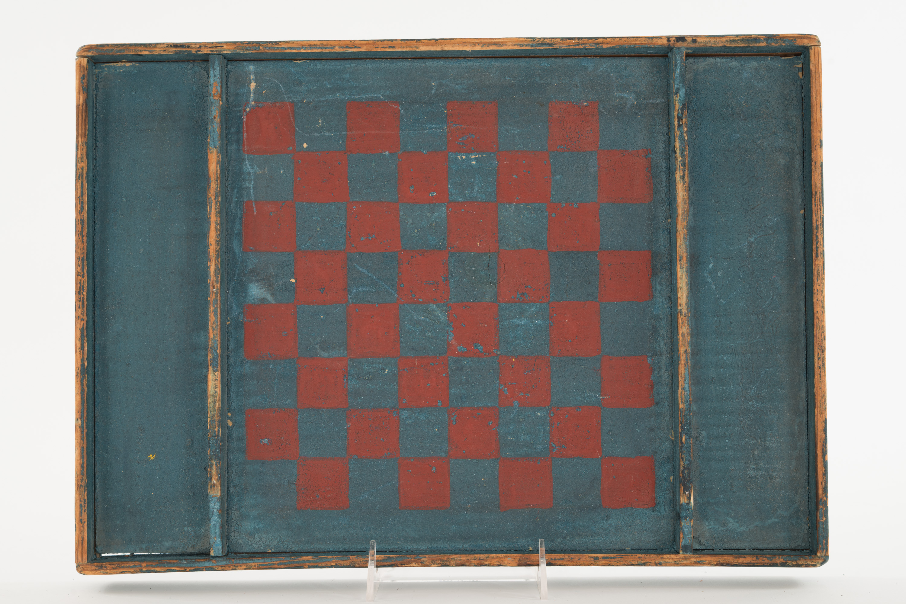 Vintage blue and red painted wooden chess/checker board with discarded game piece compartments on two sides of the board and a low lip around the perimeter.