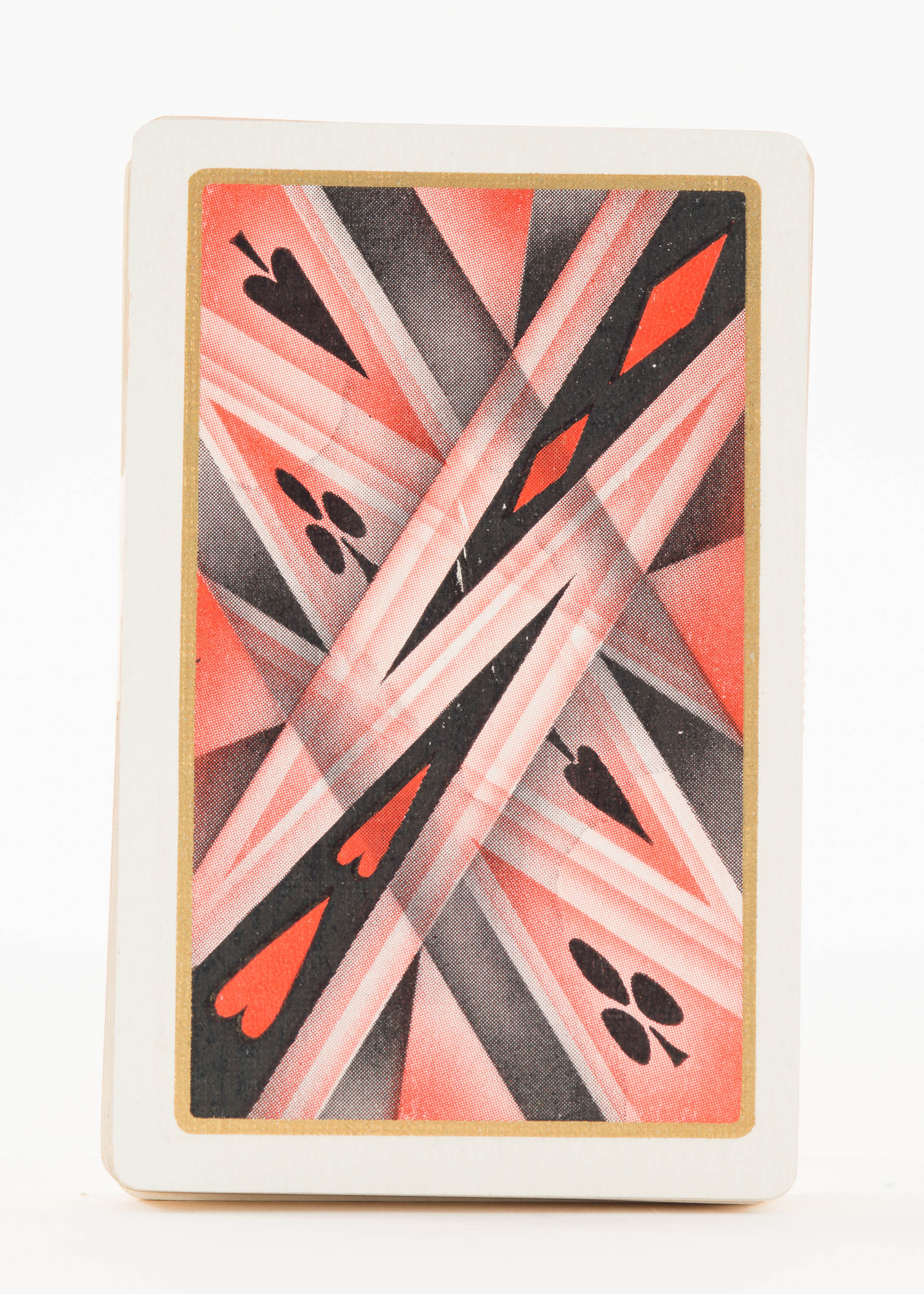 Vintage deck of playing cards with abstract pink black and red card suite design with a thin metallic gold border and edge