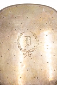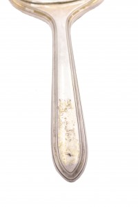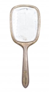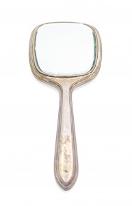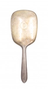 Vintage rectangular silver metal hand mirror with a dot pattern and an engraved monogram