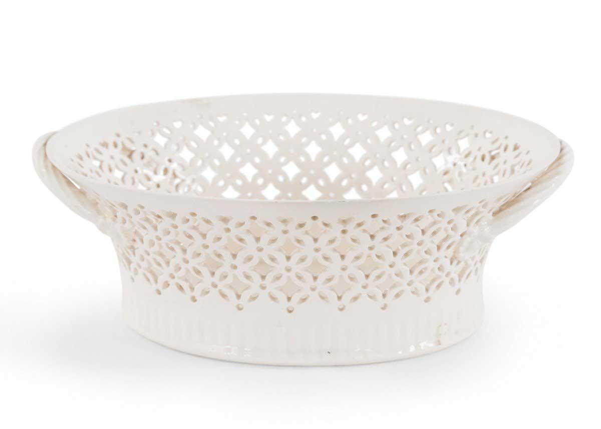 Vintage round, white glazed decorative porcelain bowl with reticulated sides, two twisted handles, and a ribbed base (Related item: MP2079K)