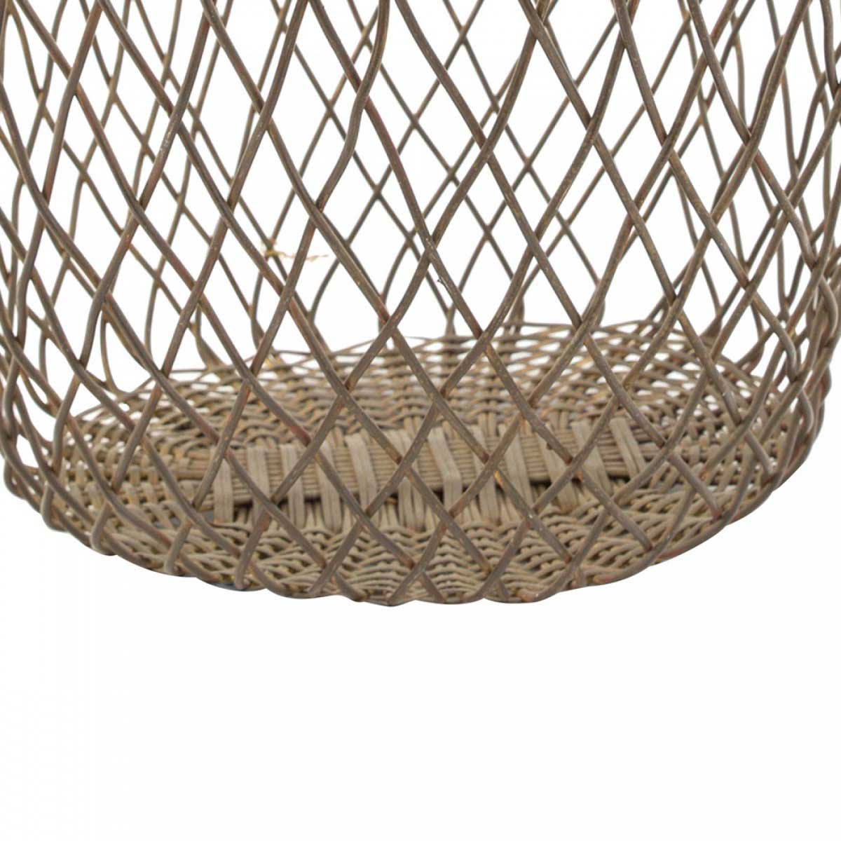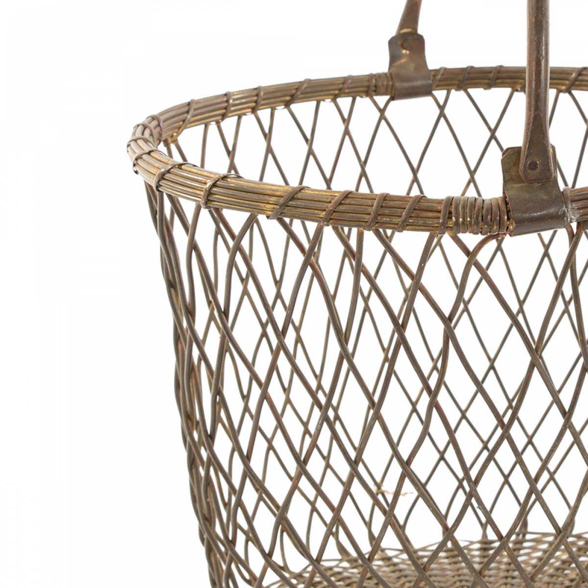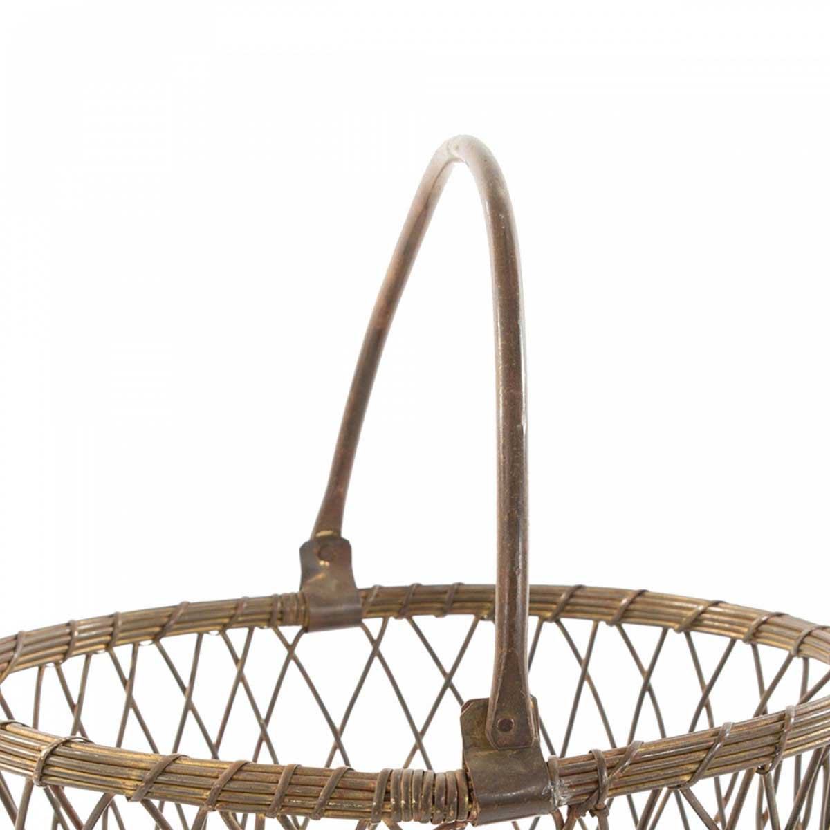 Vintge tall oval patinated metal wire latticed basket with basket-woven bottom and pivoting metal handle
