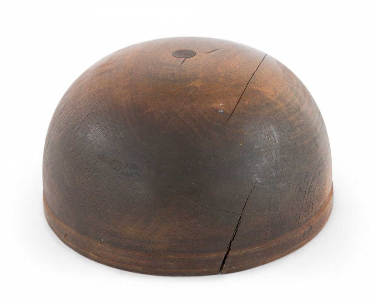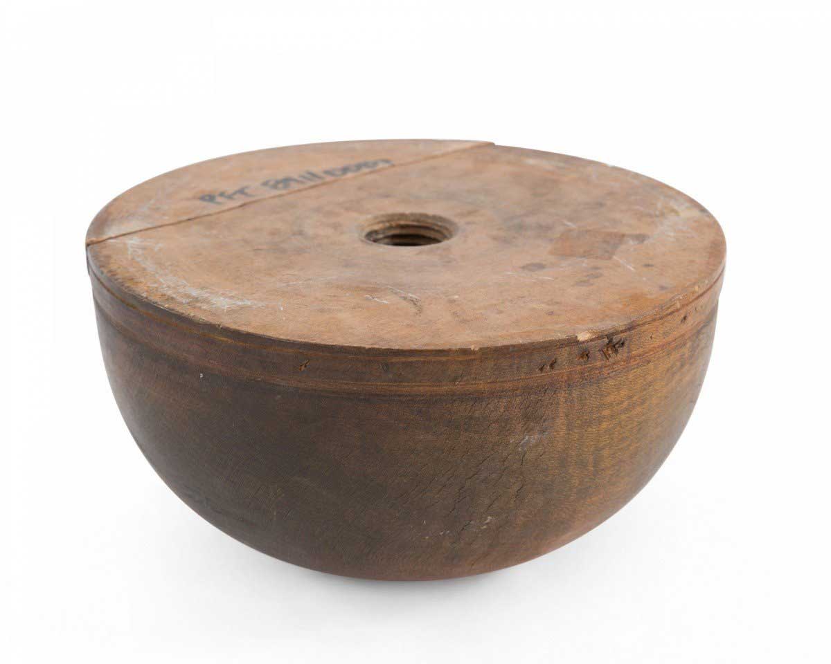 Vintage polished round, domed dark wood millinery block with a central threaded hole in the bottom