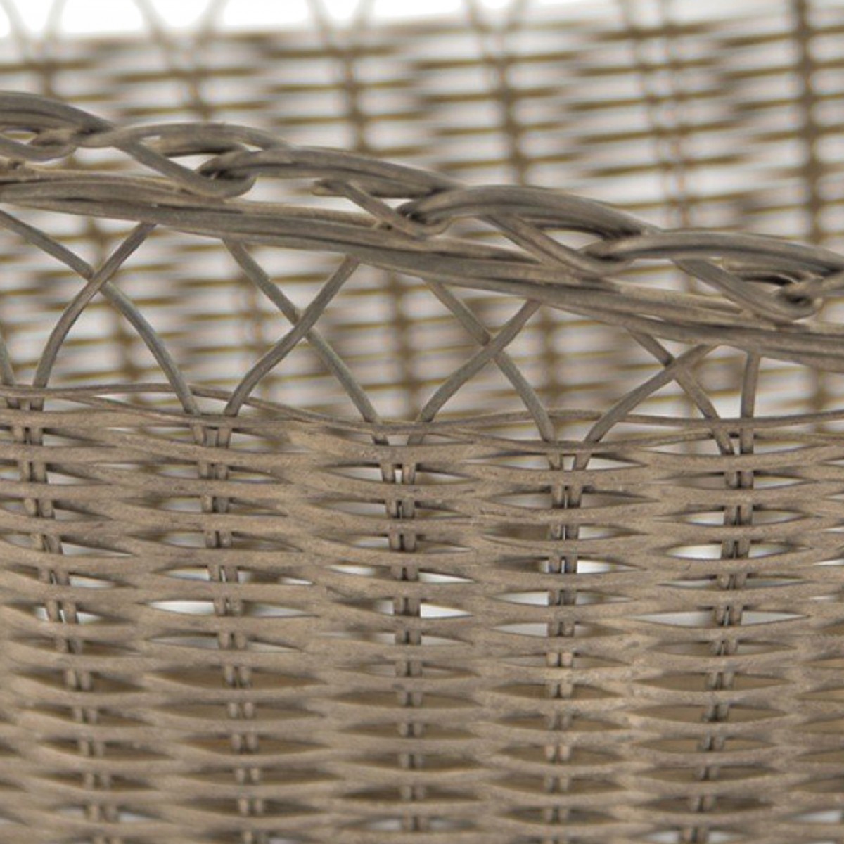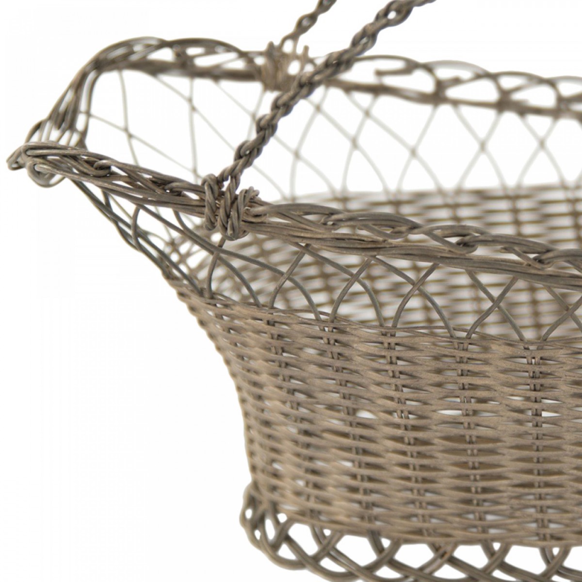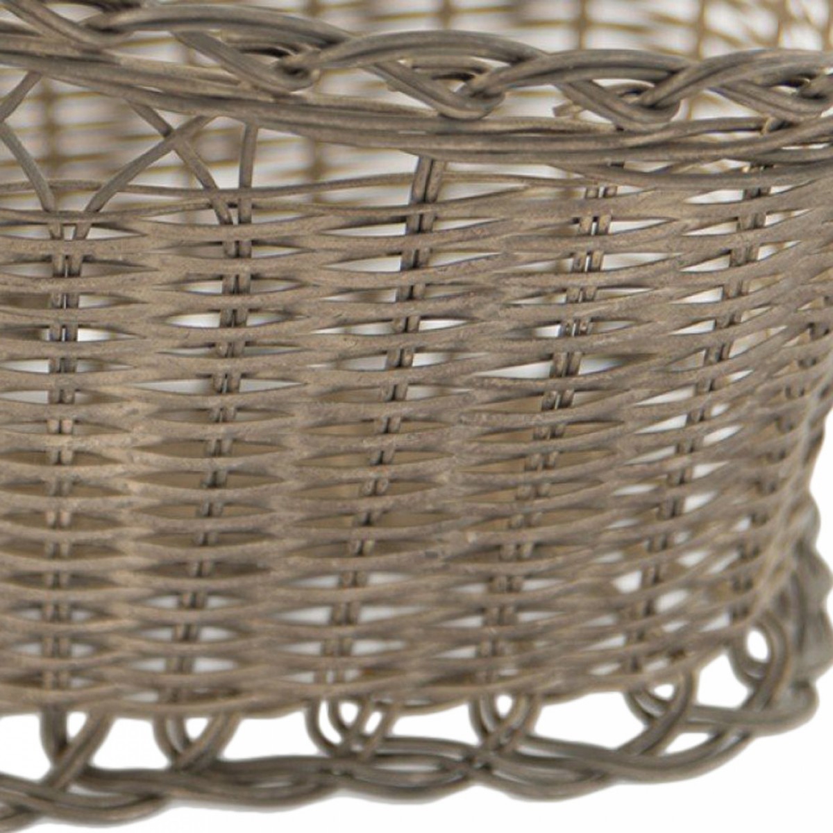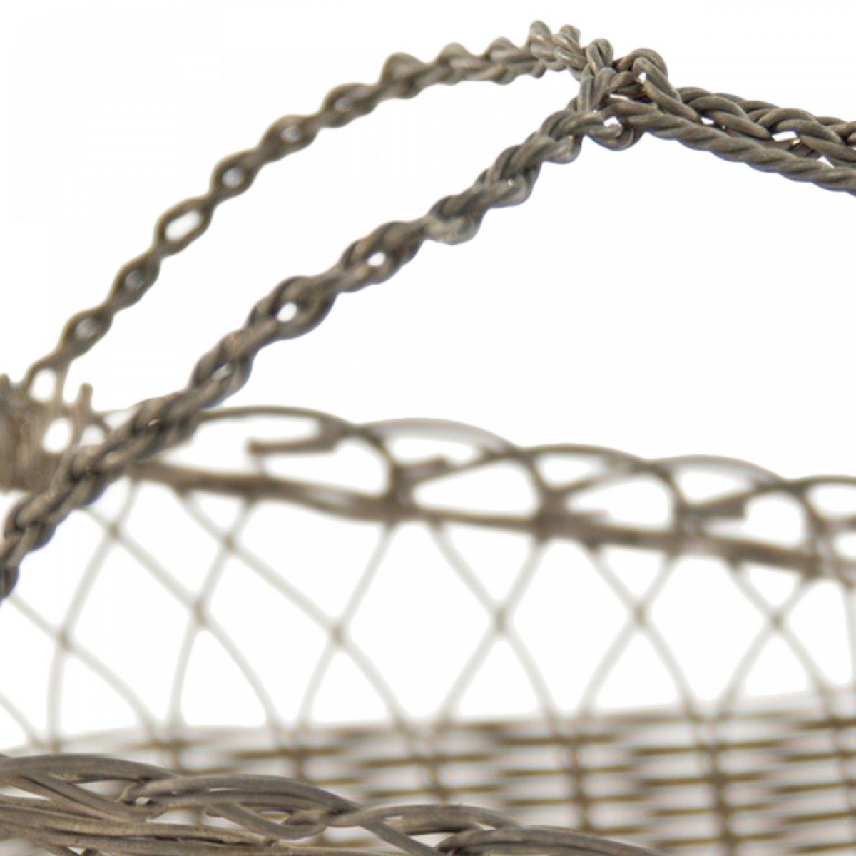 Vintage rectangular woven wire basket with braided decorative edges, slanted rim, and T-shaped braided wire handle