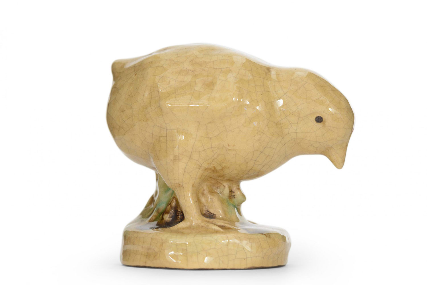 Vintage yellow glazed ceramic statue of a chick on a round base