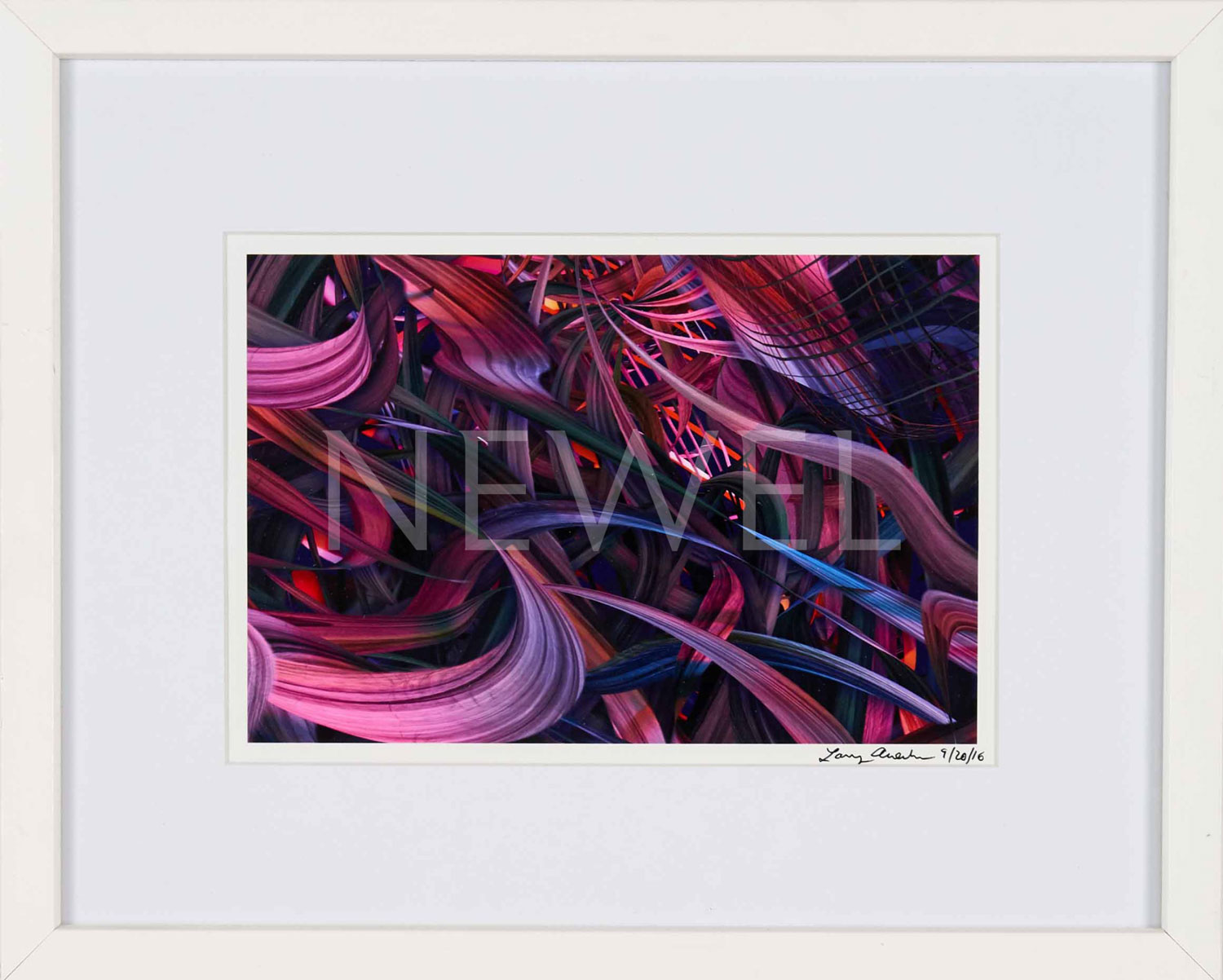 Contemporary abstract print of pink and purple jungle flora in a rectangular white frame with white matting titled "Wasteland of Thickets Pink Misty Jungle" Companion pieces: AAP022, AAP023, AAP024, AAP025, AAP027)