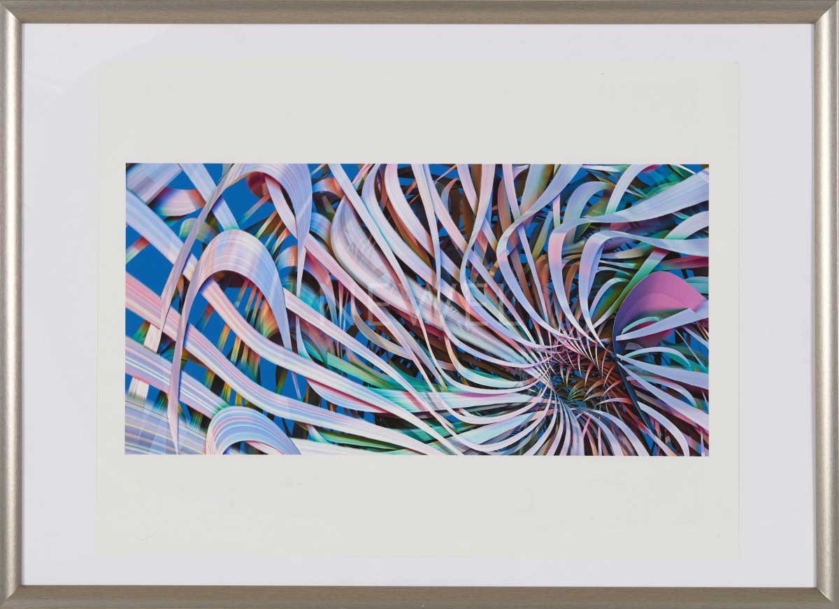 Contemporary abstract digital art titled, "Wasteland of Thickets Violet II" in beige matting and a silver rectangular frame (Companion piece: AAP107)