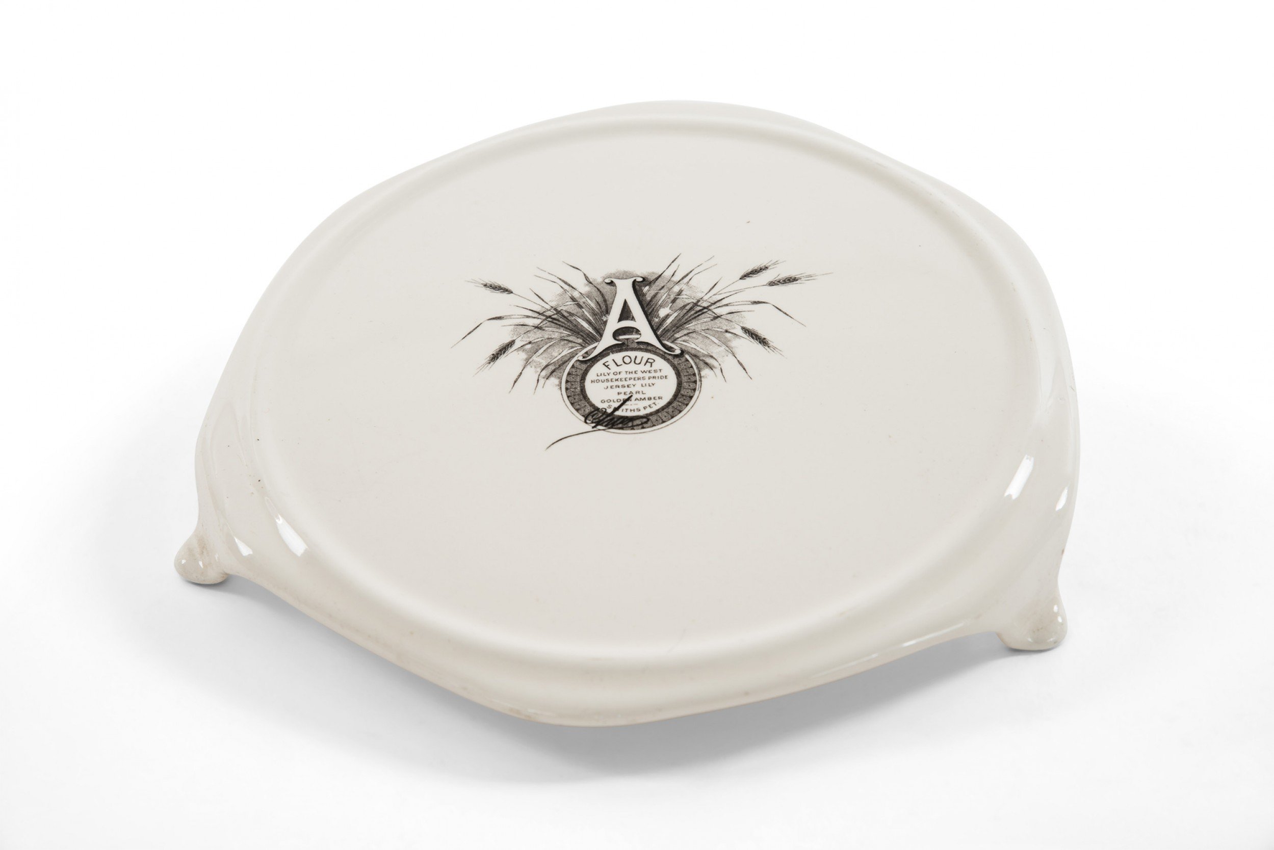2 white ceramic circular trivets with 3 ceramic feet featuring a black outline of the letter "A" on wheat stalks with an inscription by Lily of the West Flour (PRICED EACH)