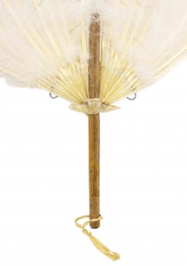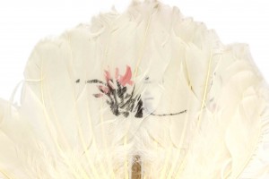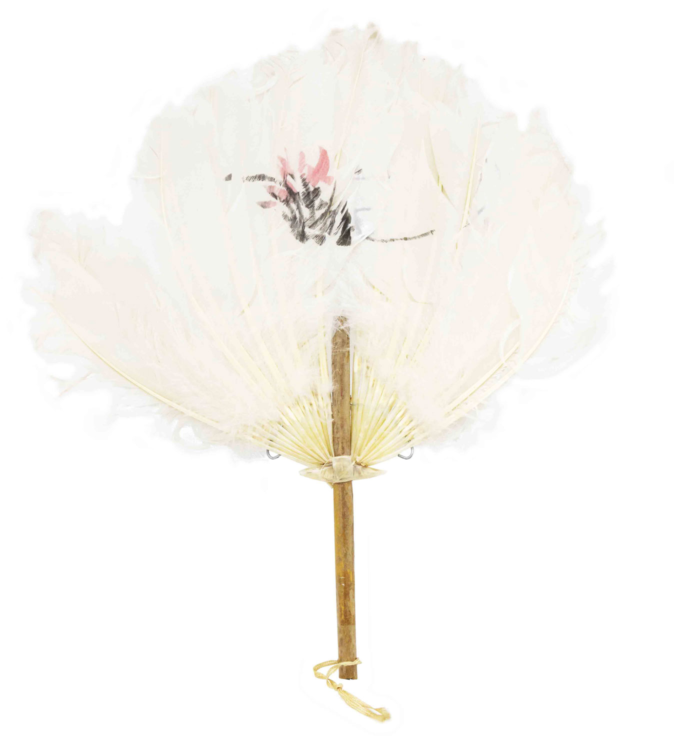 Round white feather hand fan with faint black and pink painted design and a light wood handle with a tan fabric tie