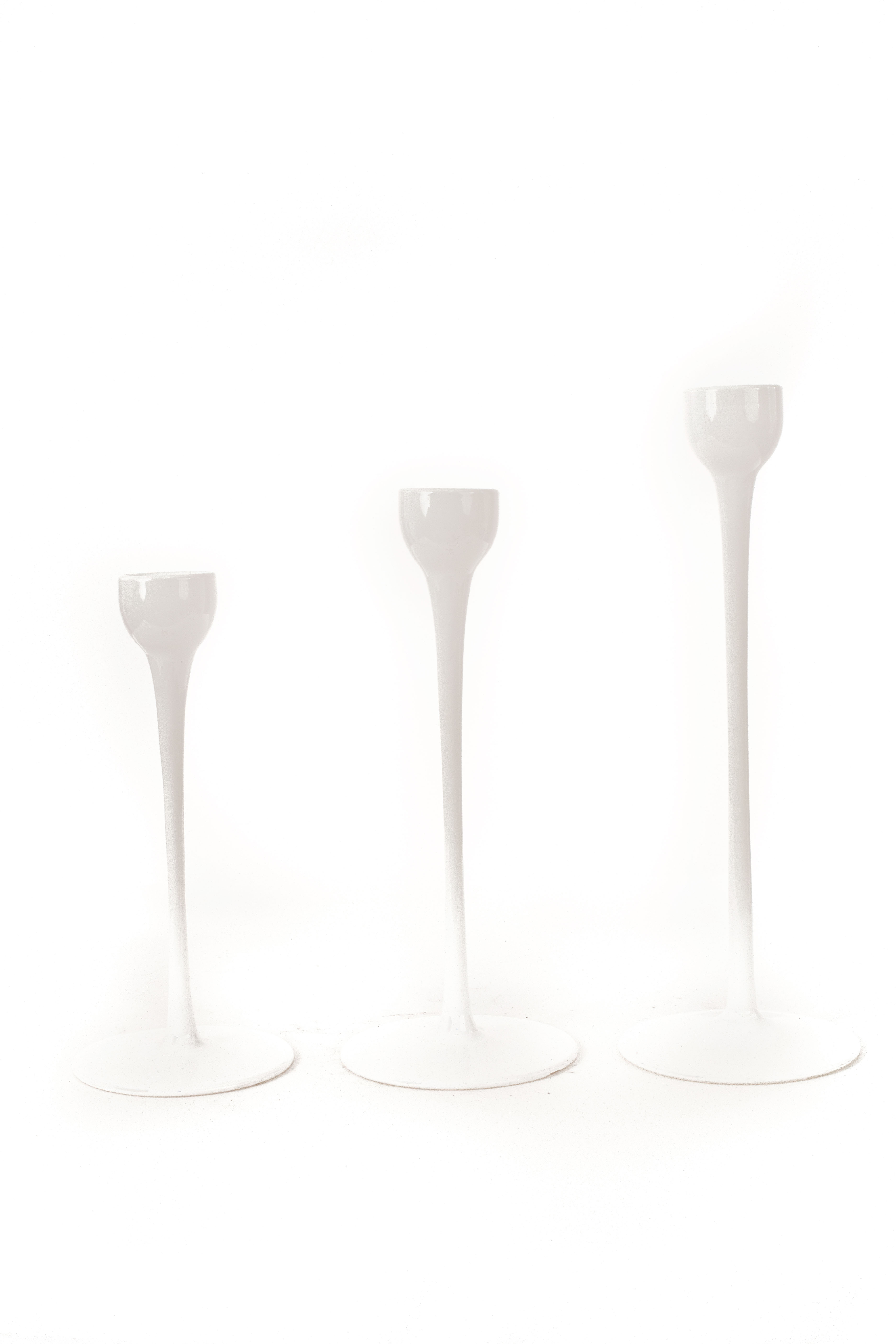 Set of 3 white glass taper candle holder with circular bases, thin bodies, and upped tops in 3 heights (Small: 9.5" h Medium: 11" h Tall:12.75" h) (PRICED AS SET)