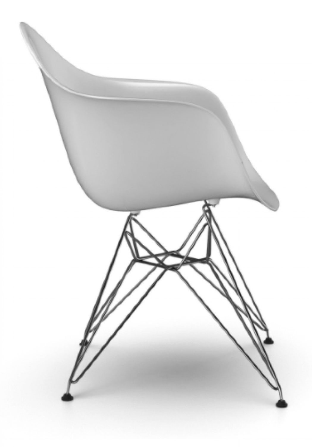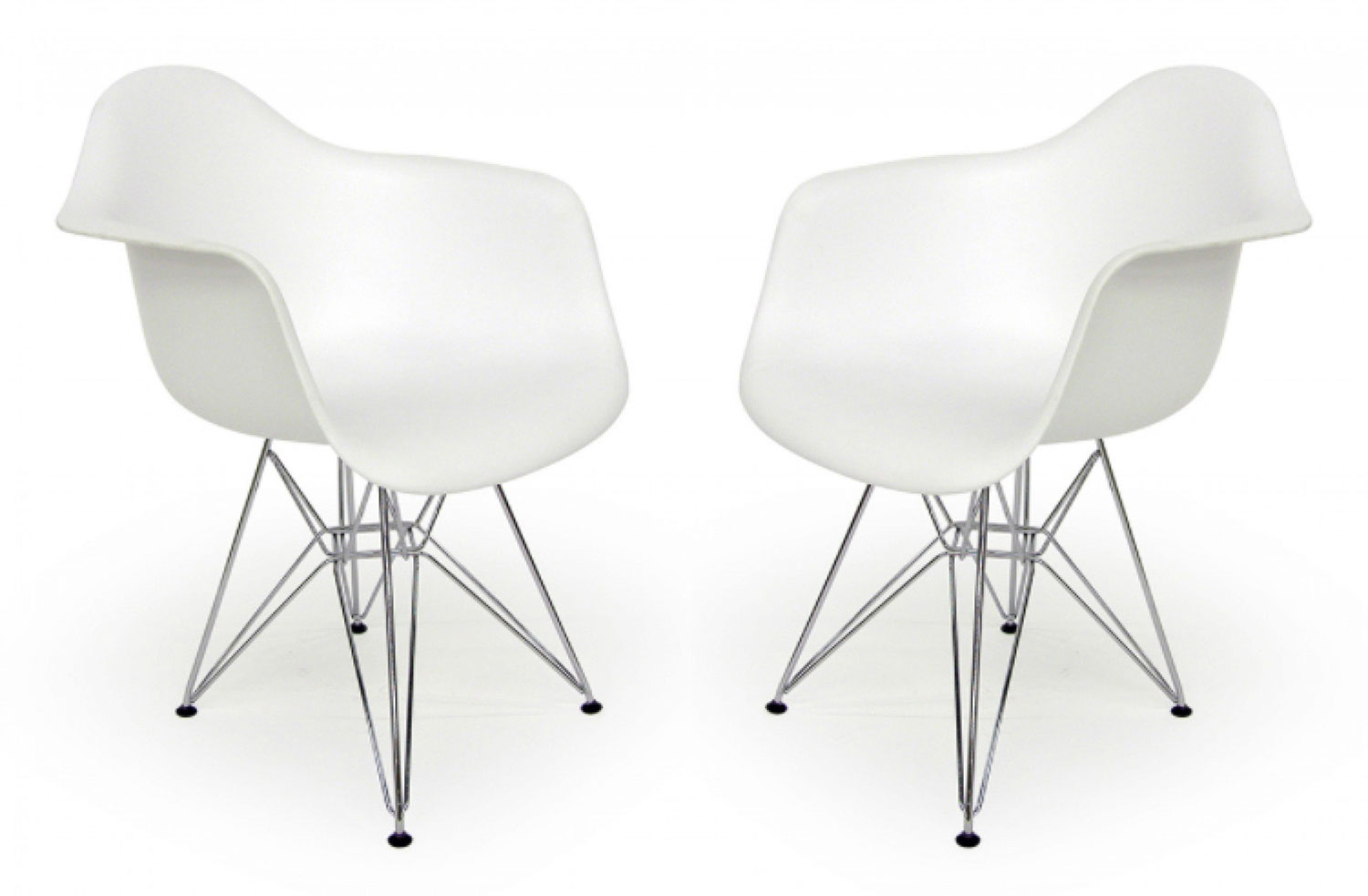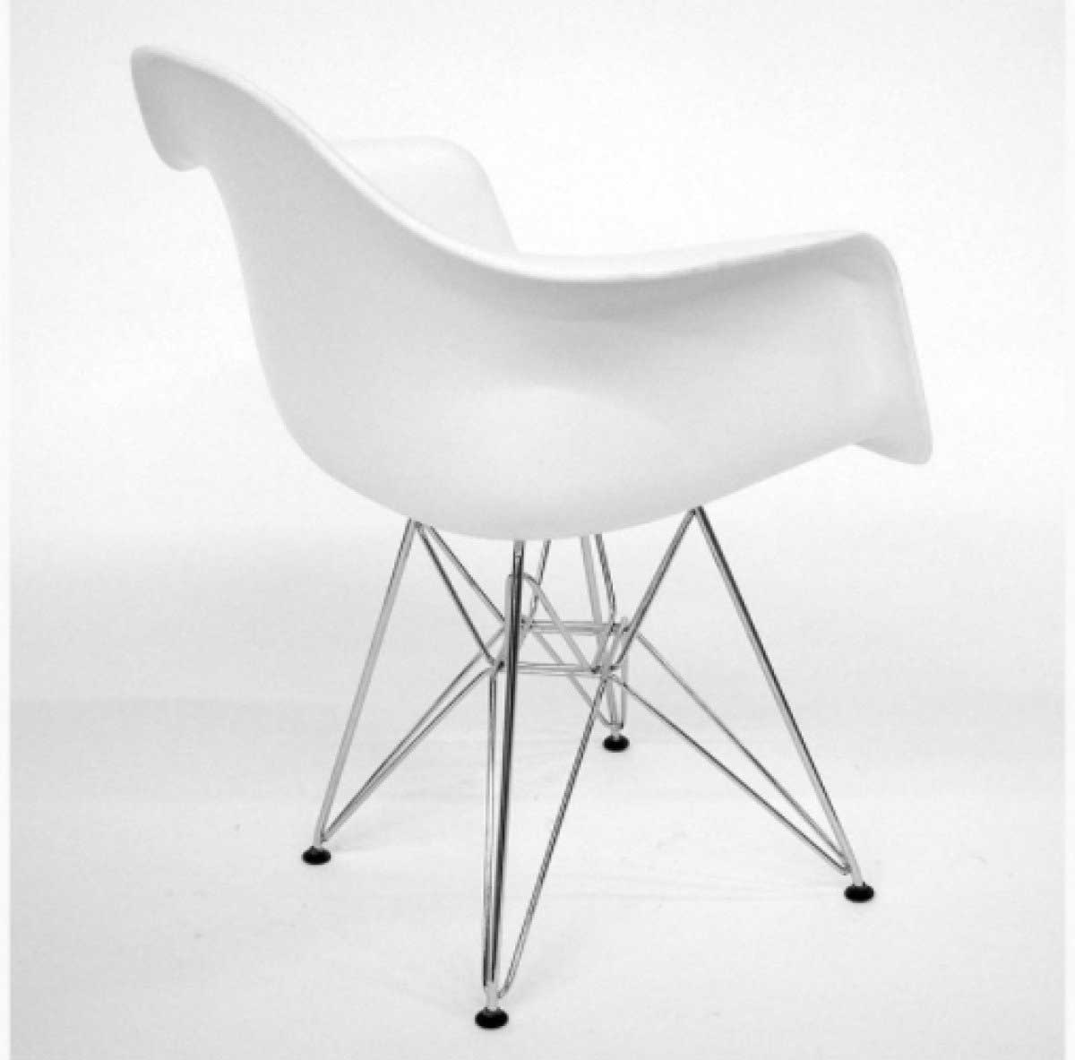 6 Mid-Century style molded fiberglass arm chair with a white matte finish supported on stainless steel wire legs connected with a stretcher. (PRICED EACH)