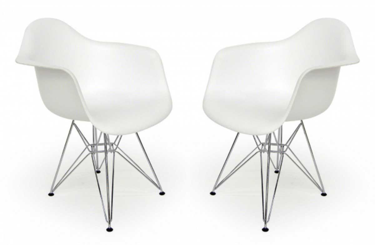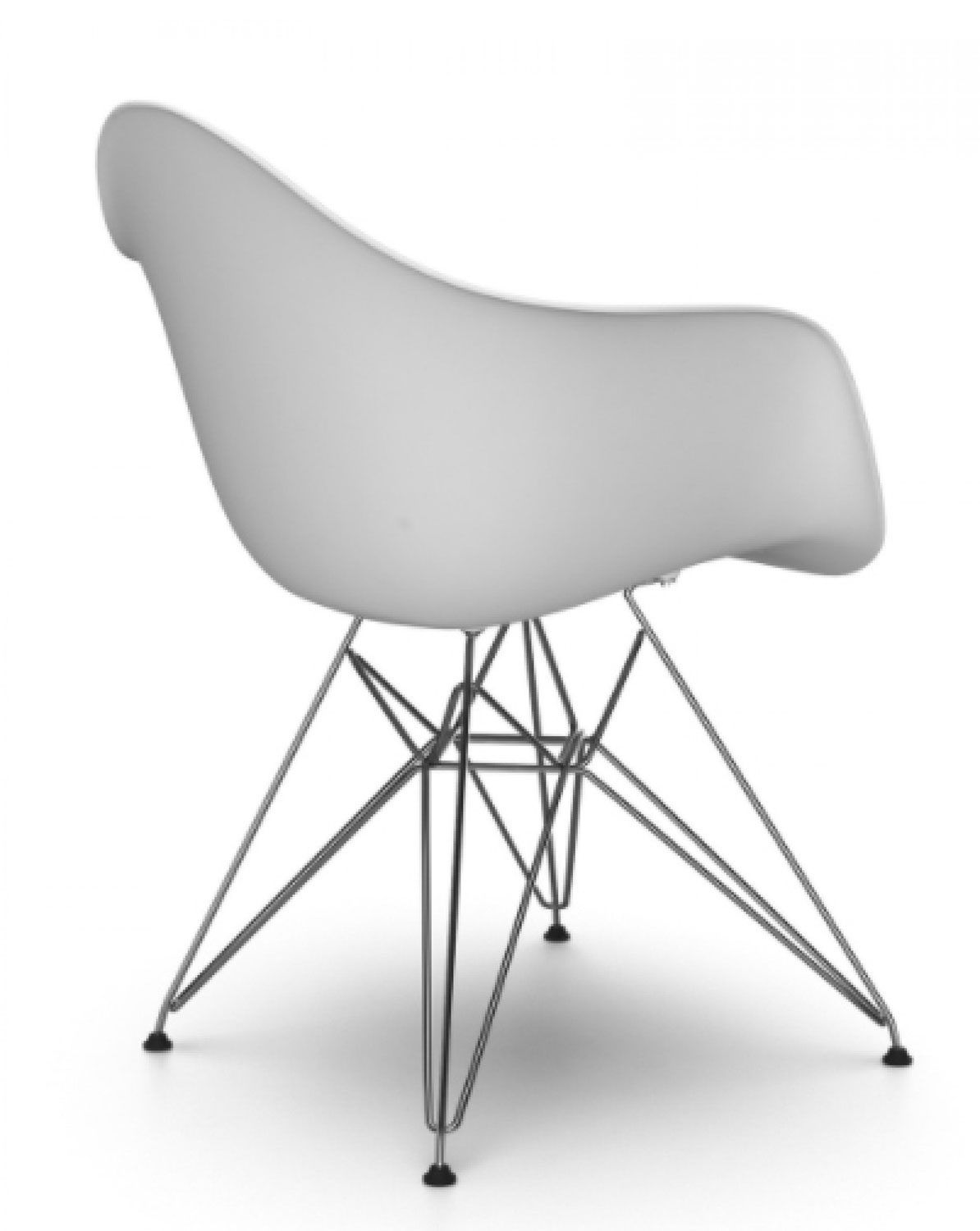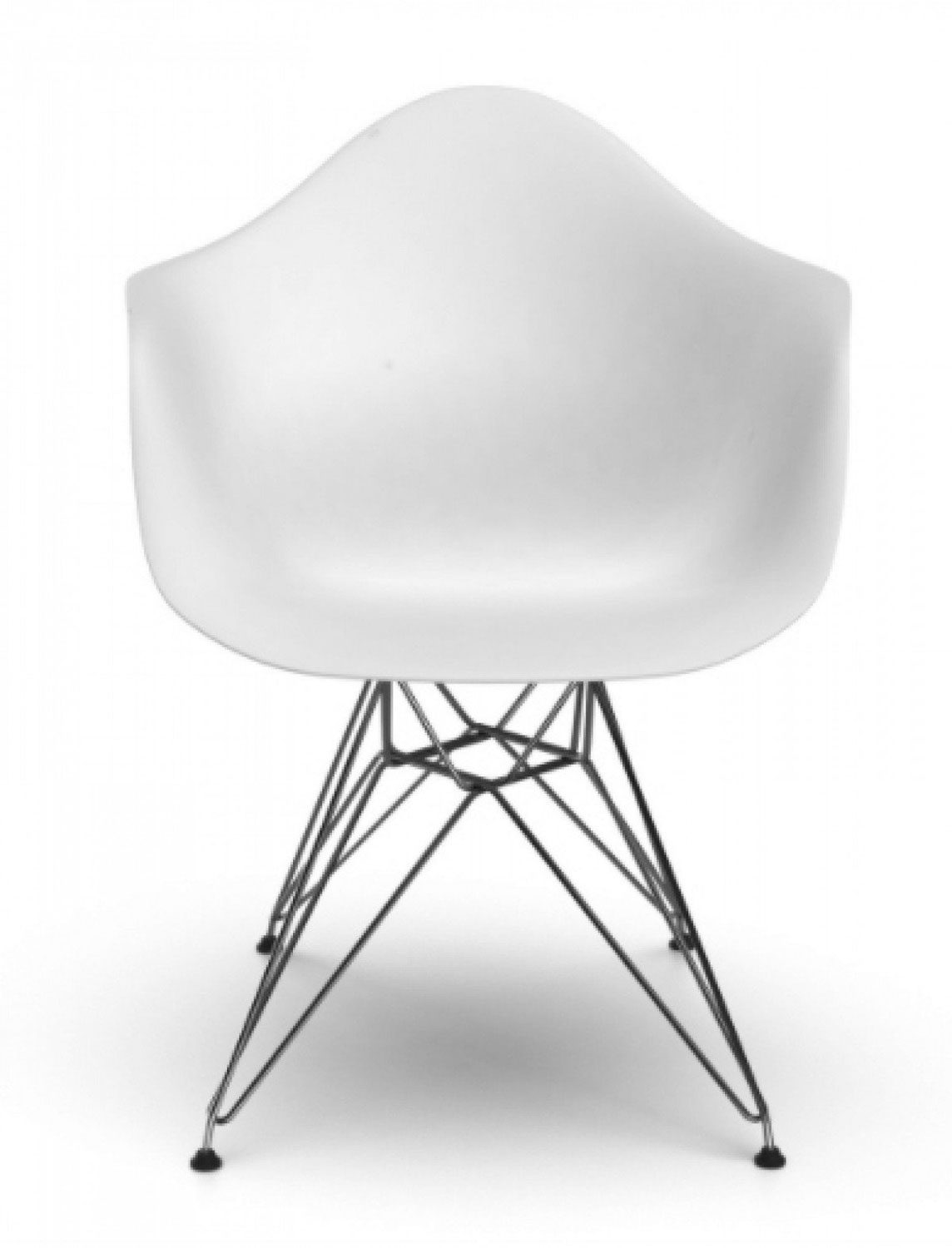 6 Mid-Century style molded fiberglass arm chair with a white matte finish supported on stainless steel wire legs connected with a stretcher. (PRICED EACH)
