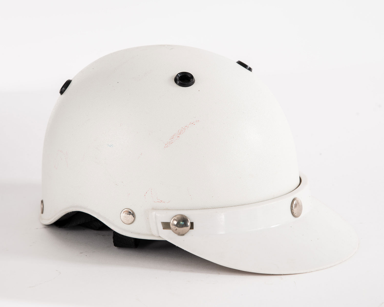 White pebbled plastic equestrian helmet with a smooth white plastic visor, a black webbing and plastic chin strap, and silver metal studs.