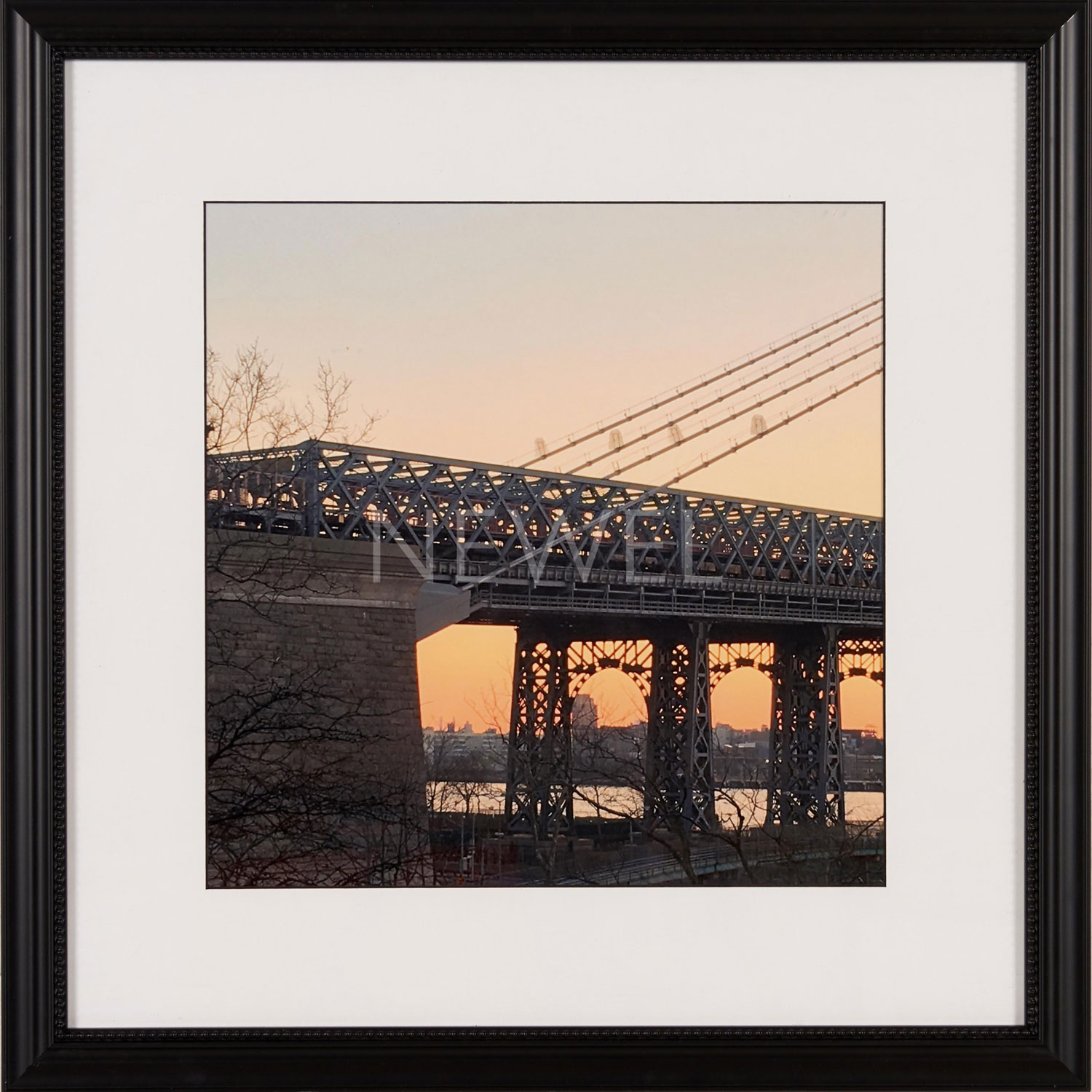 Contemporary photograph of the Williamsburg Bridge at sunset in white matting and a black square frame titled, "Williamsburg Bridge Manhattan Side March 2 II" (Part of a series: AAP068, AAP070, AAP071)