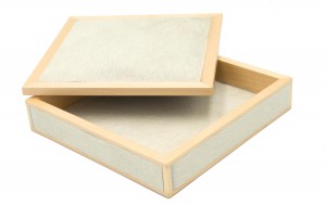 Contemporary square accessory box with a light wood frame, white pony hair sides, and a gray suede interior (Made in Italy)