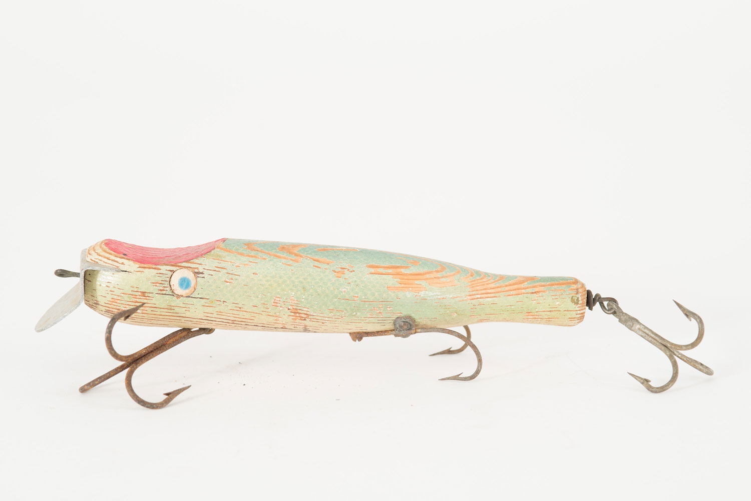 Vintage hand carved and hand painted green and red wooden fishing lure with three sets of multi-pronged hooks.