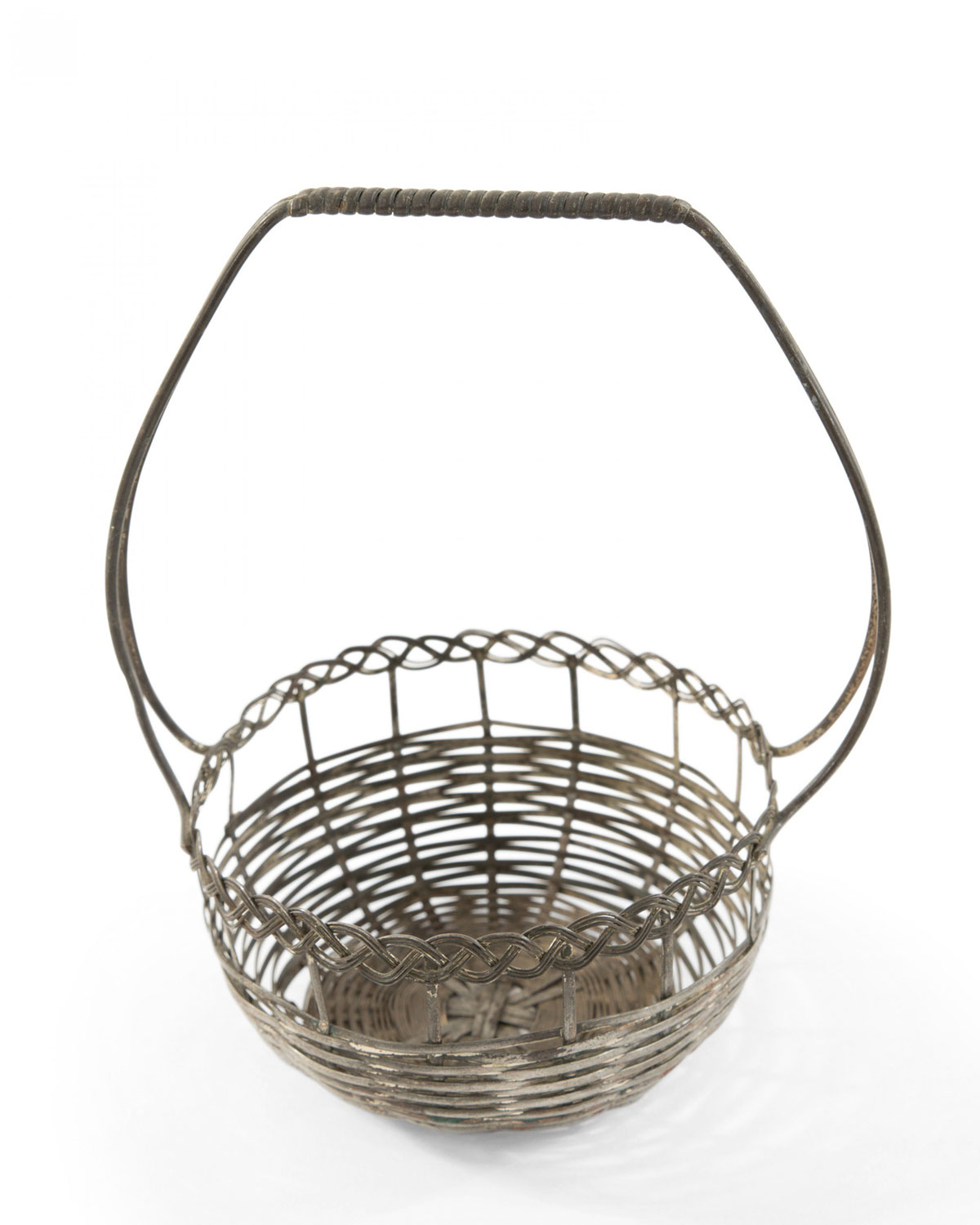 Small round patinated metal woven basket with braided edge and tall metal handle