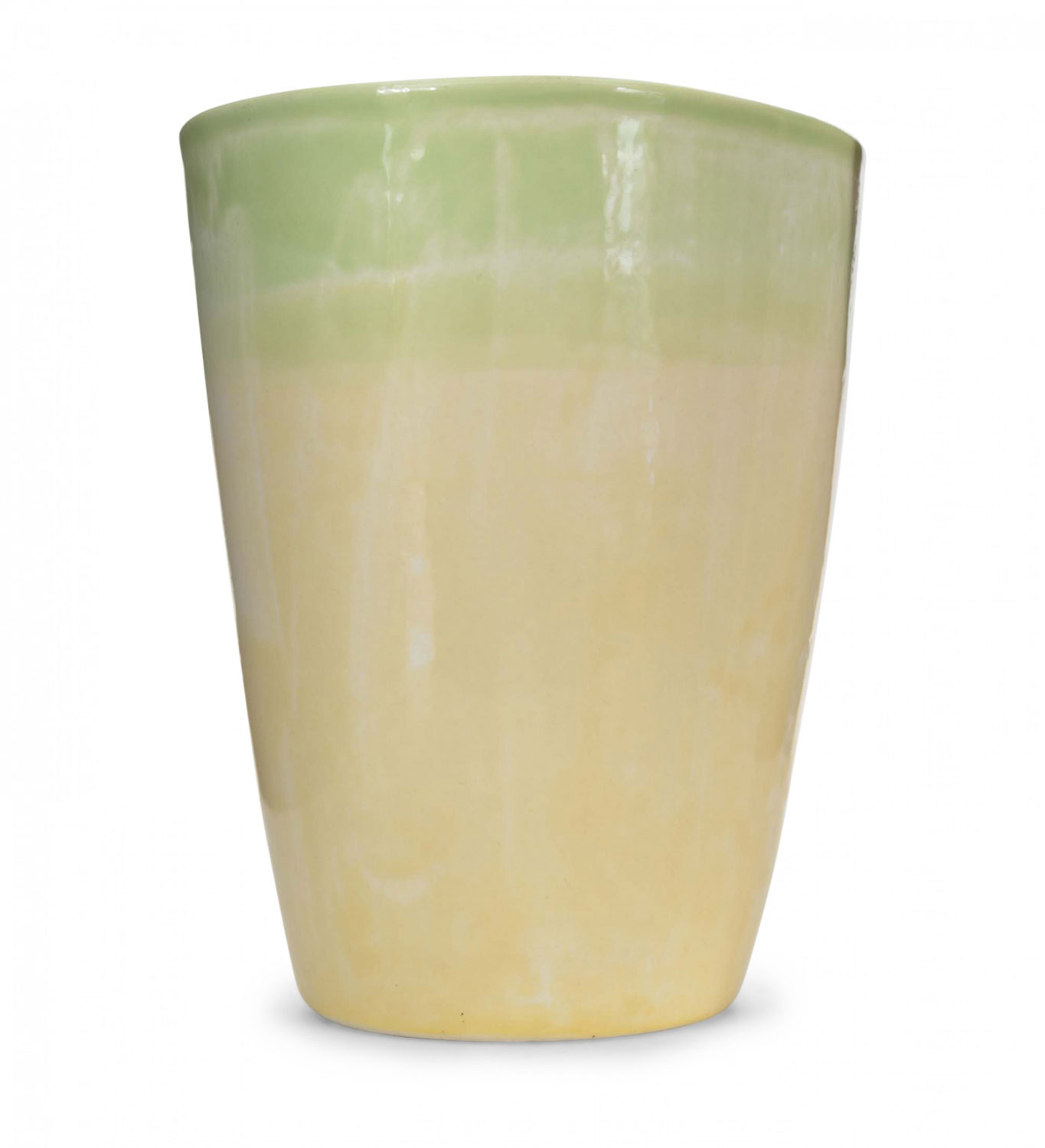 Pale yellow glazed ceramic vase/planter with light green glaze on top quarter